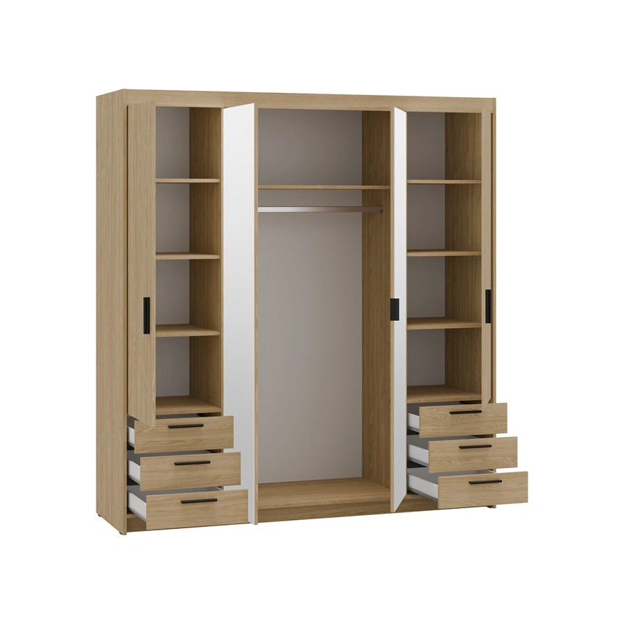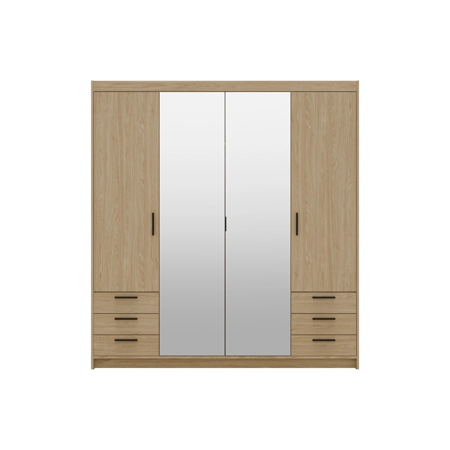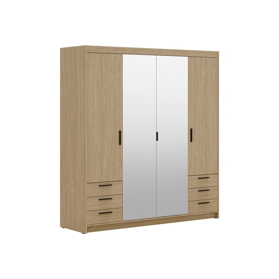 Der Schrank besteht aus 4 Türen und 6 Schubladen. Die Garderobe garantiert bequem i problemlos nutzung und haltbarkeit des gesamten Möbelstücks für viele Jahre der Nutzung. Kombination aus aus Natureiche mit schwarzen Griffen macht den Schrank erfolgreich als Schlafzimmerschrank, als Dielenschrank oder als Kinderzimmergarderobe. Die verspiegelten Kleiderschränke von Rene sind auch eine gute Wahl für ein Babyzimmer. Er eignet sich auch perfekt als Garderobe für den Flur.
