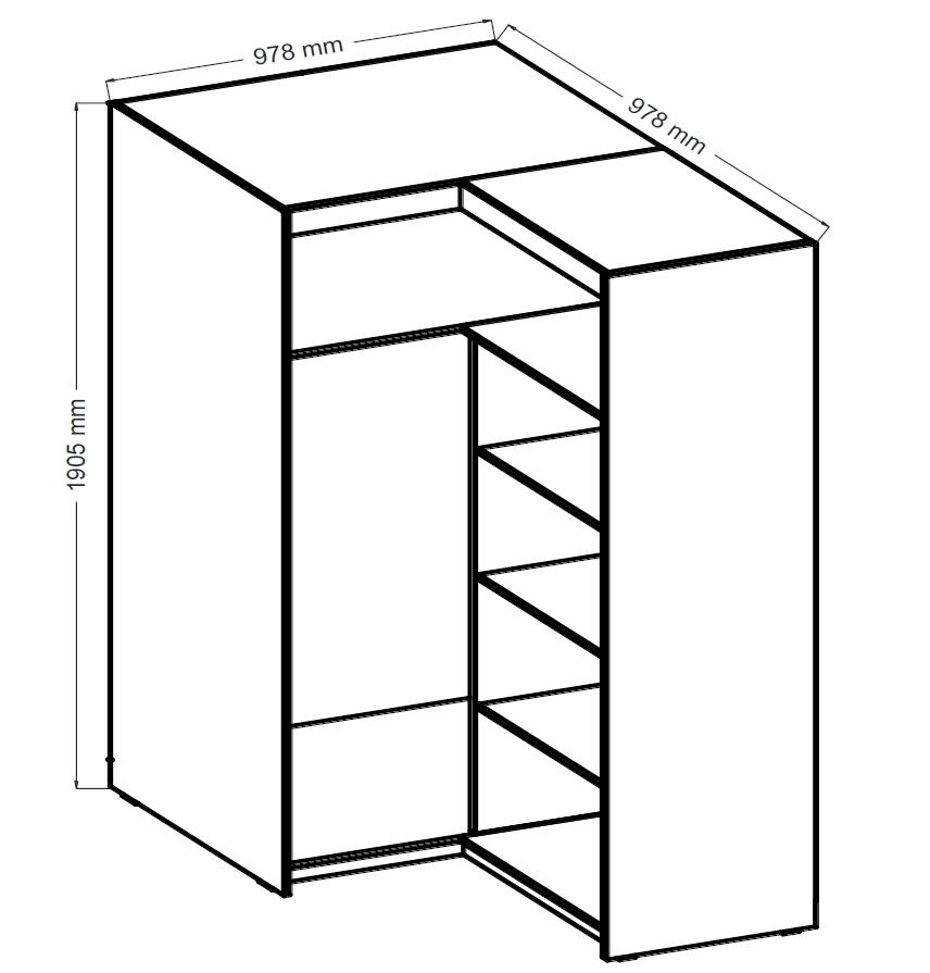 Rena Garderobe ist unterteilt in teil mit Bar und teil mit Regalen. Geräumiger Kleiderschrank der Eckkleiderschrank bietet Platz für all Ihre Habseligkeiten und notwendigen Accessoires. Robuste Konstruktion aus hochwertig laminierter Platte gewährleistet die Langlebigkeit und Stabilität des Schranks, was eine langfristige Zufriedenheit mit der Nutzung garantiert.