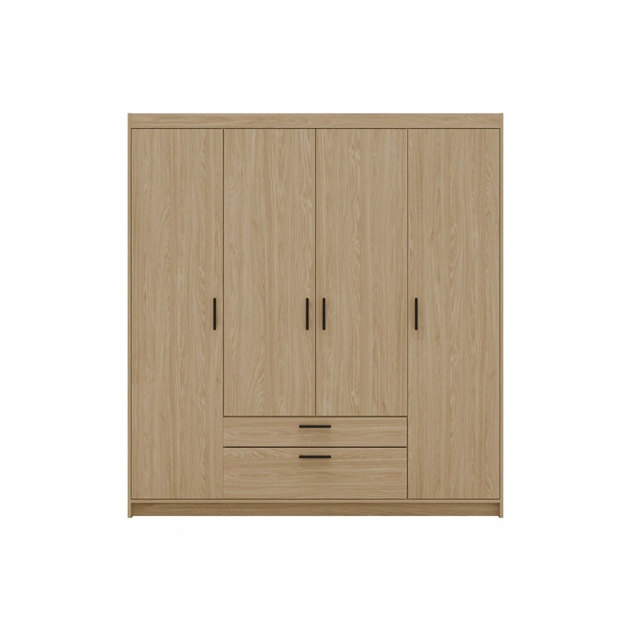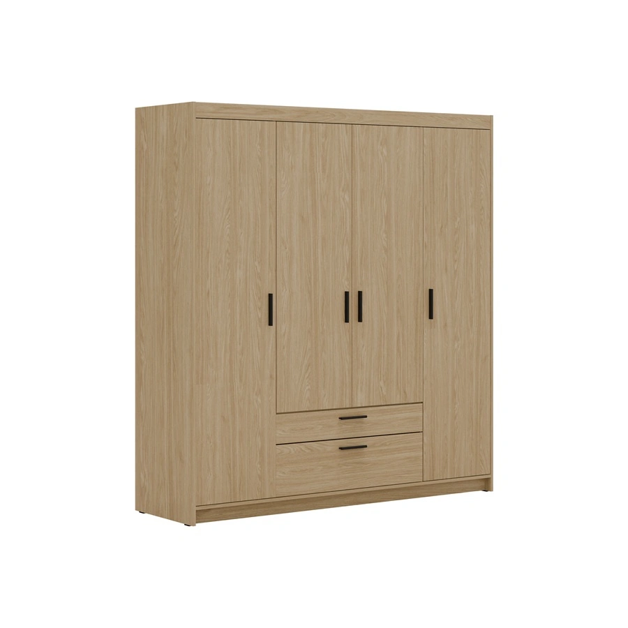 Der Schrank besteht aus 4 Türen und 2 Schubladen. Die Garderobe garantiert bequem i problemlos nutzung und haltbarkeit des gesamten Möbelstücks für viele Jahre der Nutzung. Kombination aus aus Natureiche mit schwarzen Griffen macht den Schrank erfolgreich als Schlafzimmerschrank, als Dielenschrank oder als Kinderzimmergarderobe. Die modularen Kleiderschränke von Rene sind auch eine gute Wahl für ein Babyzimmer. Er eignet sich auch perfekt als Garderobe für den Flur.