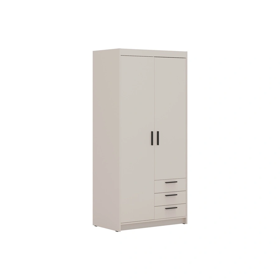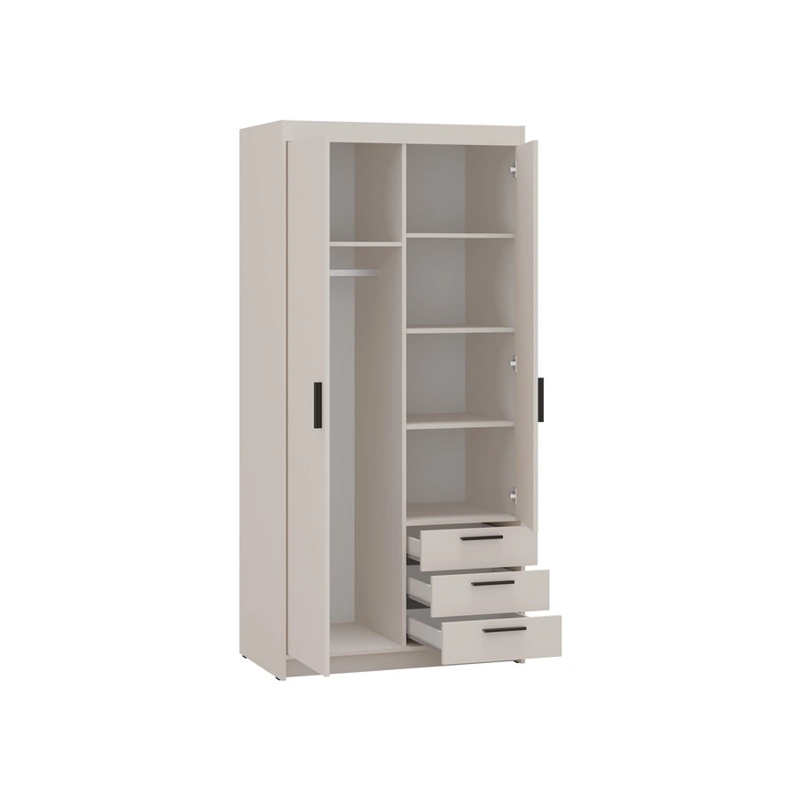 Der Schrank besteht aus 2 Türen und 3 Schubladen. Die Garderobe garantiert bequem i problemlos nutzung und haltbarkeit des gesamten Möbelstücks für viele Jahre der Nutzung. Kombination aus sandbeige mit schwarzen Griffen macht den Schrank erfolgreich als Schlafzimmerschrank, als Dielenschrank oder als Kinderzimmergarderobe. Die modularen Kleiderschränke von Rene sind auch eine gute Wahl für ein Babyzimmer. Er eignet sich auch perfekt als Garderobe für den Flur.