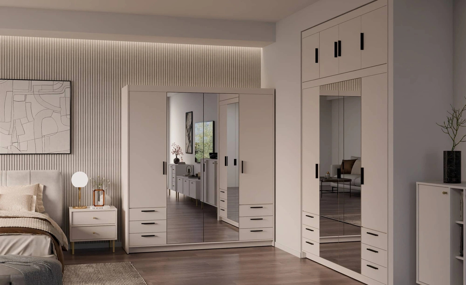 Kleiderschrank Rene 176 cm beige Sand stilvolles Design ABS beendet Rand trimmen Kleiderschrank mit Spiegel für Schlafzimmer oder Ankleidezimmer geräumige Schubladen