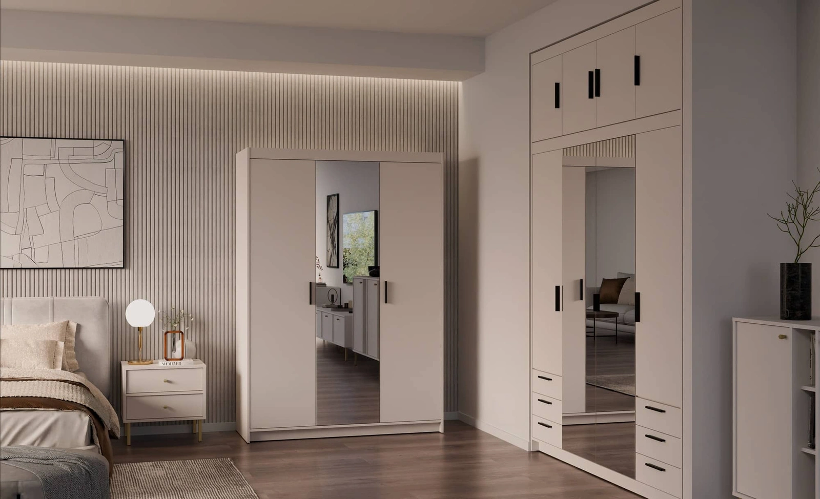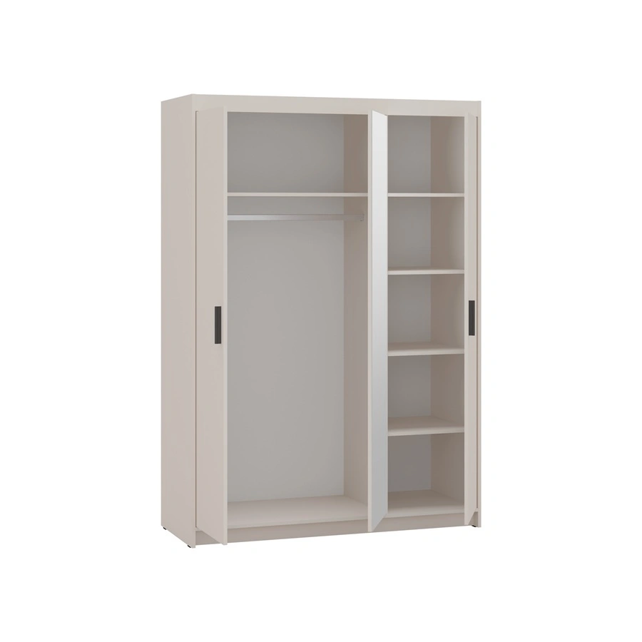 Kleiderschrank mit Spiegel Rene 133 cm sandbeige Geräumiger Kleiderschrank für das Schlafzimmer, der durch natürliche Farben hervorgehoben wird Stilvolle schwarze Griffe