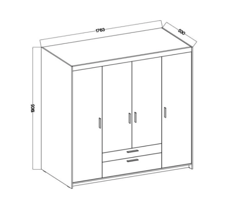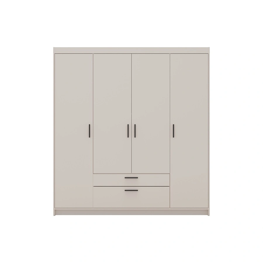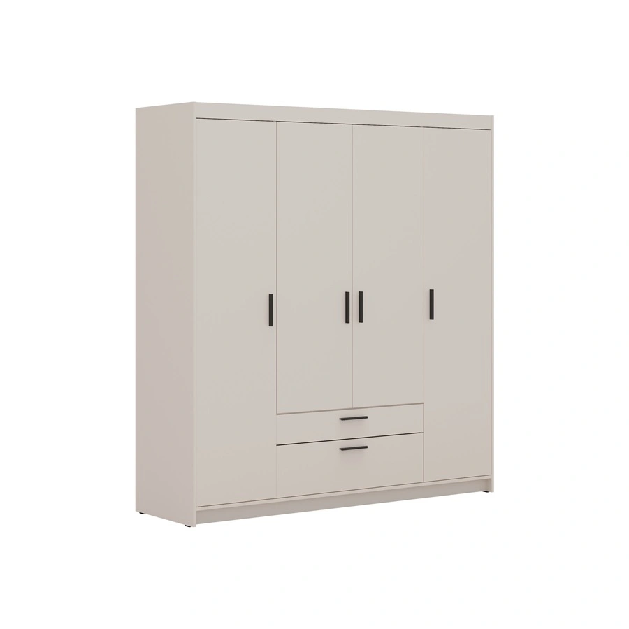 Der Schrank besteht aus 4 Türen und 2 Schubladen. Die Garderobe garantiert bequem i problemlos nutzung und haltbarkeit des gesamten Möbelstücks für viele Jahre der Nutzung. Kombination aus sandbeige mit schwarzen Griffen macht den Schrank erfolgreich als Schlafzimmerschrank, als Dielenschrank oder als Kinderzimmergarderobe. Die modularen Kleiderschränke von Rene sind auch eine gute Wahl für ein Babyzimmer. Er eignet sich auch perfekt als Garderobe für den Flur.