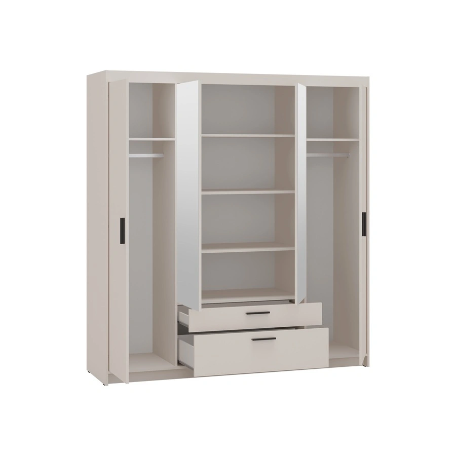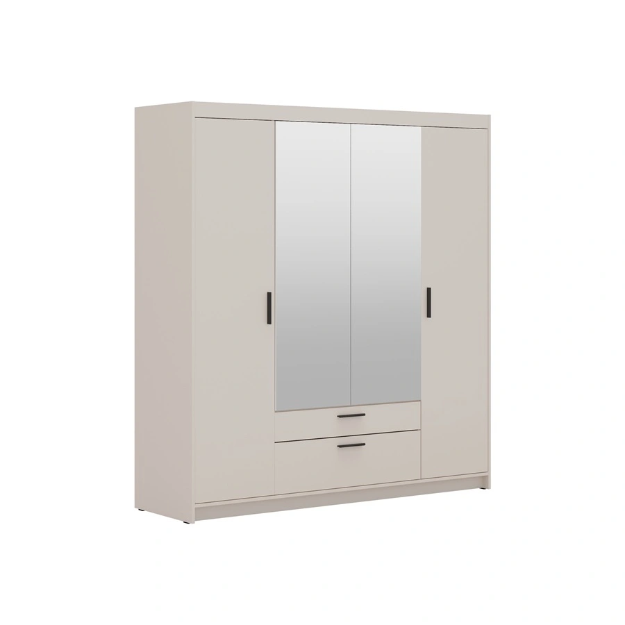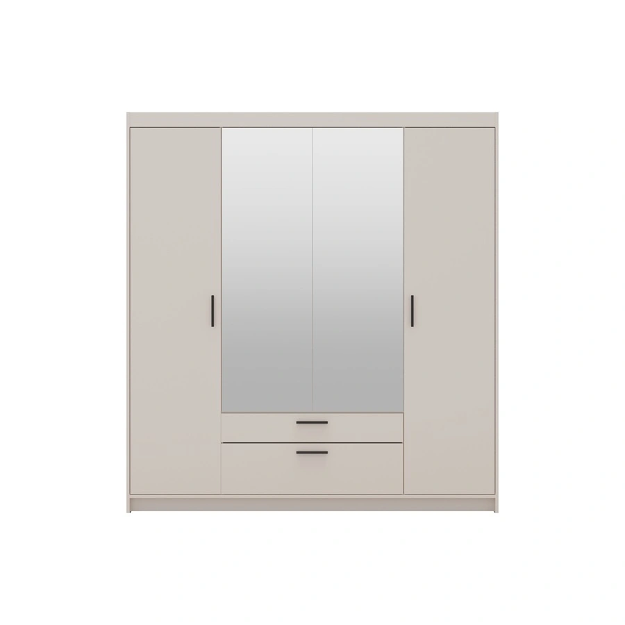 Der Schrank besteht aus 4 Türen und 2 Schubladen. Die Garderobe garantiert bequem und störungsfrei nutzung und Haltbarkeit des gesamten Möbelstücks für viele Jahre der Nutzung. Kombination aus sandbeige mit schwarzen Griffen macht den Schrank erfolgreich als Schlafzimmerschrank, als Dielenschrank oder als Kinderzimmergarderobe. Die verspiegelten Kleiderschränke von Rene sind auch eine gute Wahl für ein Babyzimmer. Er eignet sich auch perfekt als Garderobe für den Flur.