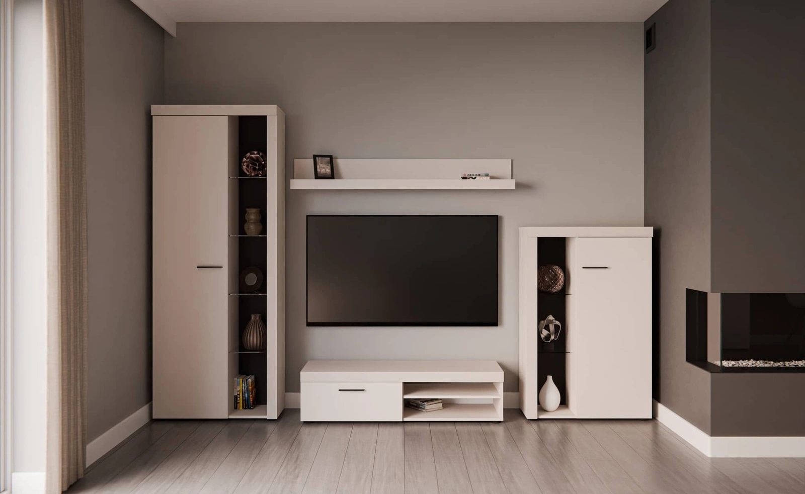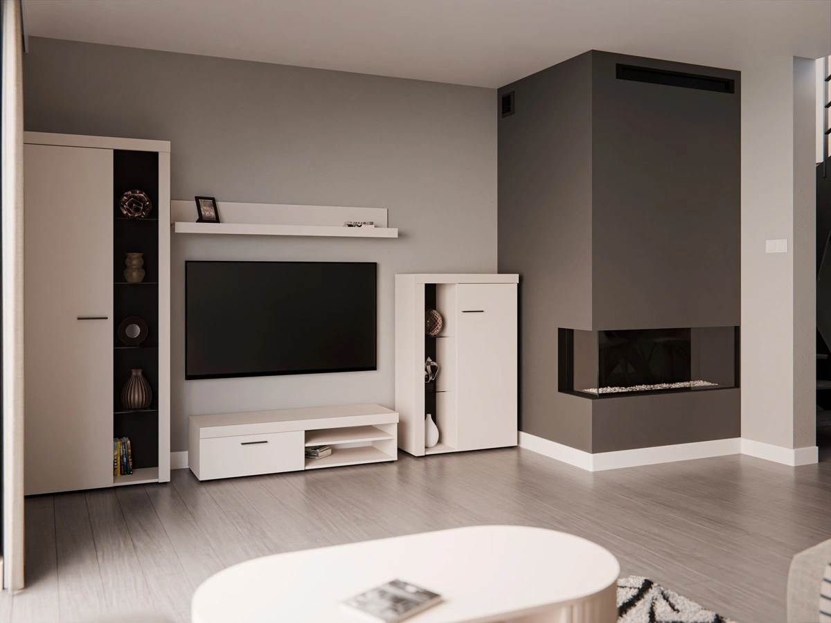 - Die Wohnwand Rene ist ein stilvolles Möbelstück, das sich perfekt in jedes Wohnzimmer oder Sitzungszimmer einfügt. Es ist die ideale Wahl für Liebhaber moderner Einrichtungen mit elegantem Charakter, für die auch die umfassende Funktionalität der Möbel wi