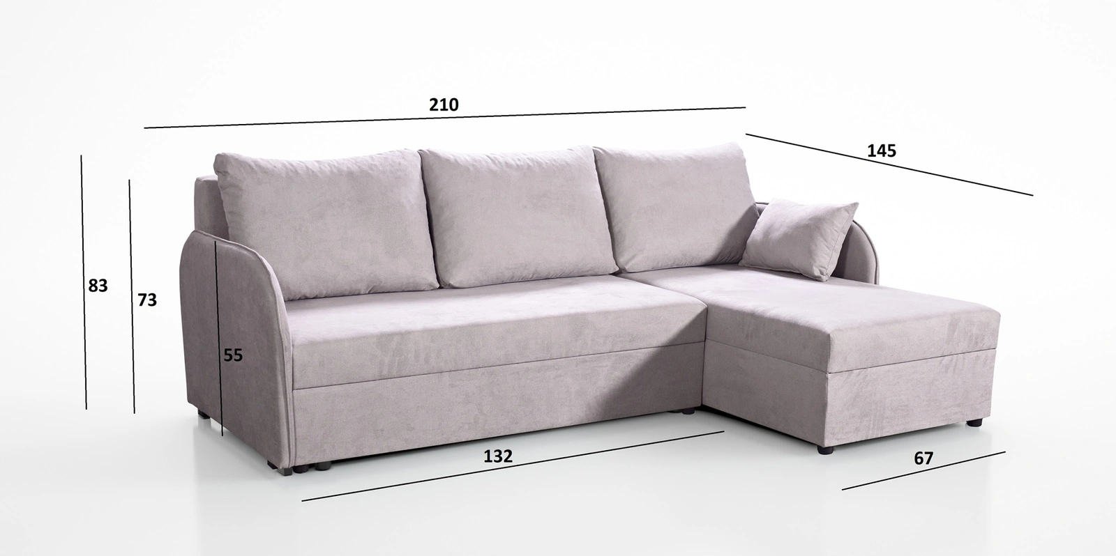 Das Ecksofa mit Schlaffunktion eignet sich dank seiner Abmessungen und seiner breiten Funktionalität ideal als Ecksofa für das Wohnzimmer oder als klappbares Ecksofa für das Gästezimmer. Ein Ecksofa mit Schlaffunktion ist auch eine gute Alternative zu einem Bett im Zimmer der jugendzimmer. Breite der Ecke 210 cm, höhe 83 cm und Tiefe 145 cm. Die Liegefläche der Eckeinheit beträgt 123x200 cm. Die Sitzhöhe des Möbels beträgt 40 cm, und die Höhe der Rückenlehne beträgt 43 cm. Polyurethan-Schaumstoff T28 ist das Material, aus dem der Sitz der Ecke hergestellt ist. Weich rückenlehnen-Kissen gewährleisten einen hohen Komfort bei der täglichen Erholung, den Sie und Ihre Gäste, die auf diesem einzigartigen Ecksofa sitzen, zu schätzen wissen werden.