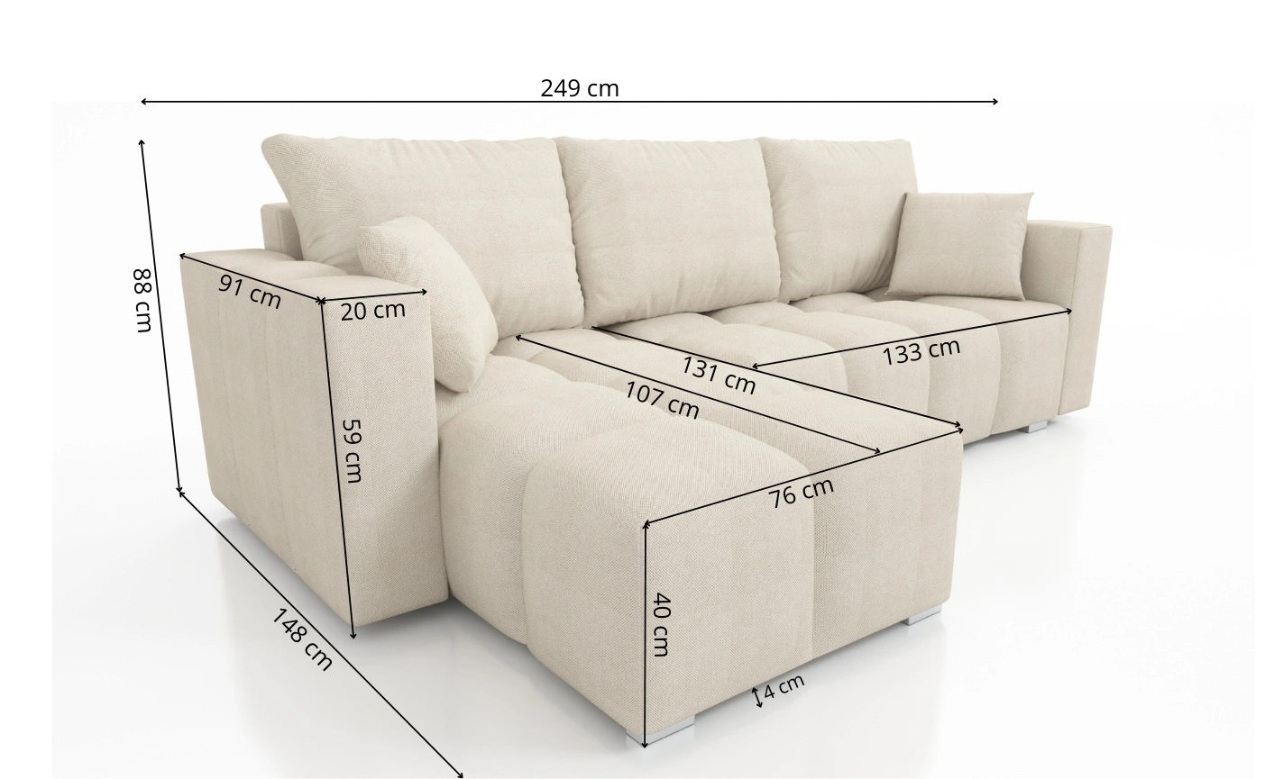Das Ecksofa mit Schlaffunktion eignet sich dank seiner Abmessungen und seiner breiten Funktionalität ideal als Ecksofa für das Wohnzimmer oder als klappbares Ecksofa für das Gästezimmer. Ein Ecksofa mit Schlaffunktion ist auch eine gute Alternative zu einem Bett im Zimmer der jugendzimmer. Breite der Ecke 249 cm, höhe 88 cm und Tiefe 148 cm. Die Liegefläche des Eckschrankes beträgt 140x208 cm. Die Sitzhöhe des Möbels beträgt 40 cm, und die Höhe der Rückenlehne beträgt 48 cm. Gewellte Federn und T28-Polyurethanschaum ist das Material, aus dem der Sitz der Ecke hergestellt ist. Weich rückenlehnen-Kissen gewährleisten einen hohen Komfort bei der täglichen Erholung, den Sie und Ihre Gäste, die auf diesem einzigartigen Ecksofa sitzen, zu schätzen wissen werden.