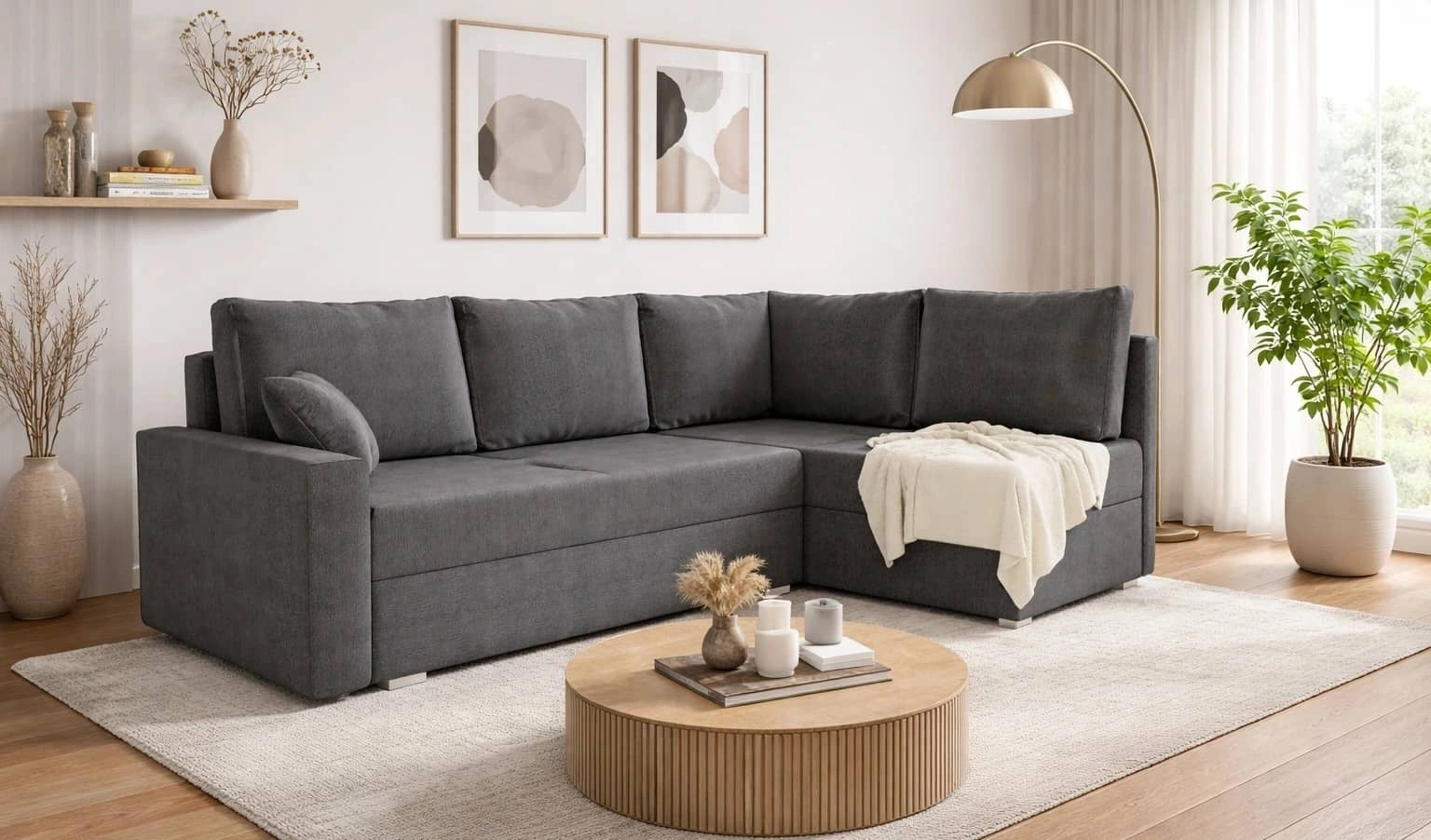 Nofi Ecksofa in Dunkelgrau ist ein geschmackvolles Stück, das sich perfekt in jedes Arrangement in Ihrem Zuhause einfügt.