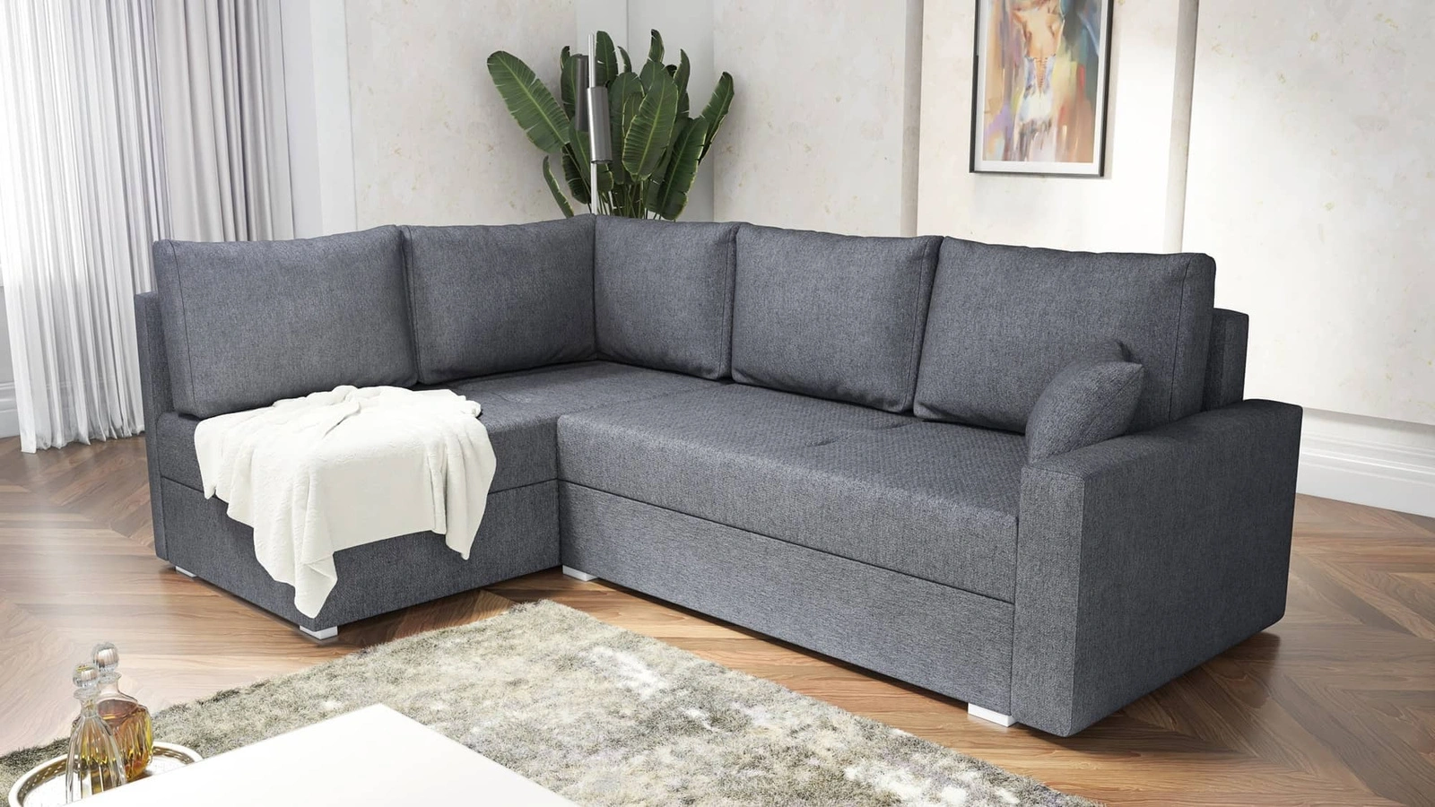 - Das Ecksofa Nofi mit Schlaffunktion ist ein geschmackvolles Möbelstück, das sich perfekt in minimalistische Einrichtungen einfügt. Das schlichte Design wurde mit einem gewebten, strukturierten Stoff mit Melange-Effekt überzogen. Ein Ecksofa sorgt für Komf