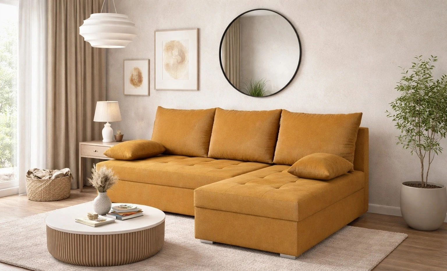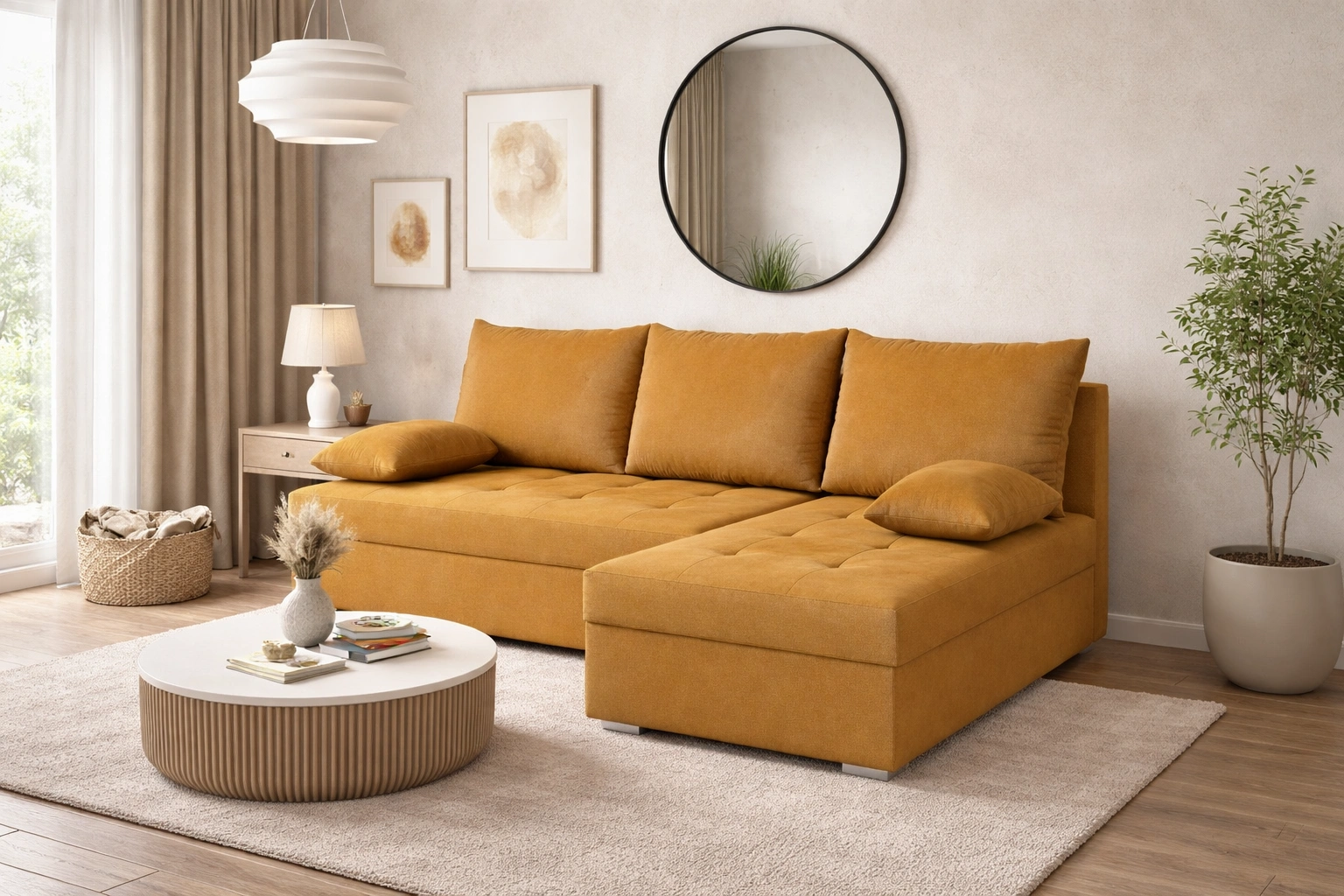 Fasti-Ecke in Senf ist die ideale Lösung für das Wohnzimmer und passt zu jeder Einrichtung.