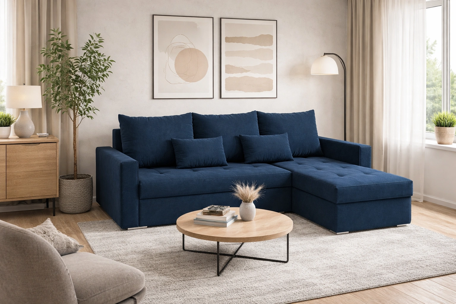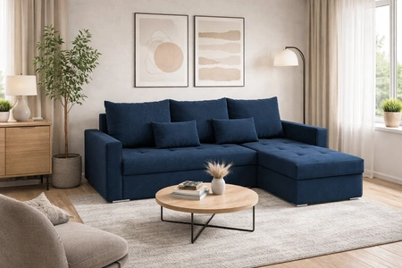 Fasti Bis Ecksofa in Marineblau ist eine ideale Lösung für das Wohnzimmer, die zu jeder Einrichtung passt.