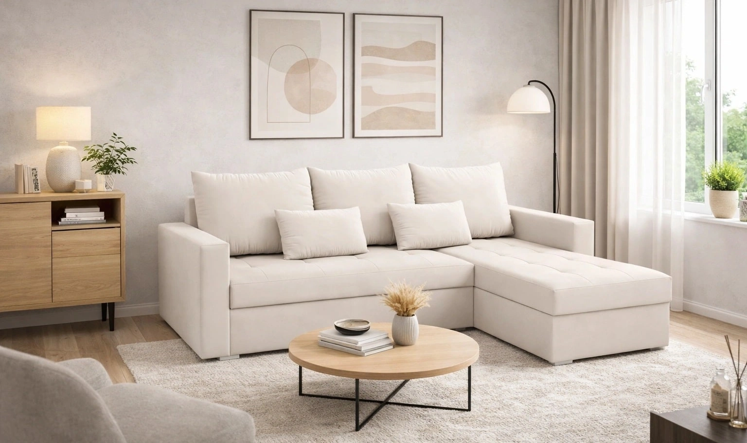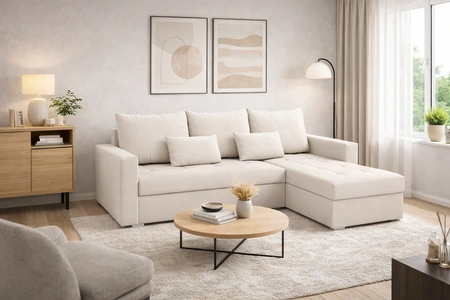 Fasti Bis Ecksofa in Hellbeige ist eine ideale Lösung für das Wohnzimmer, die zu jeder Einrichtung passt.