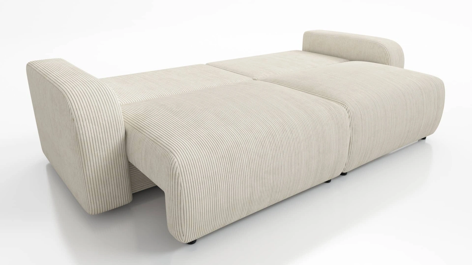 • Das Sofa Fiesta zeichnet sich durch seine hohe Eleganz und seinen Komfort aus. Die Kombination aus minimalistischem Design und abgerundeten Formen sorgt für einen unkonventionellen Look. Die Schlaffunktion und der weiche Cordstoff mit ausdrucksstarken Str
