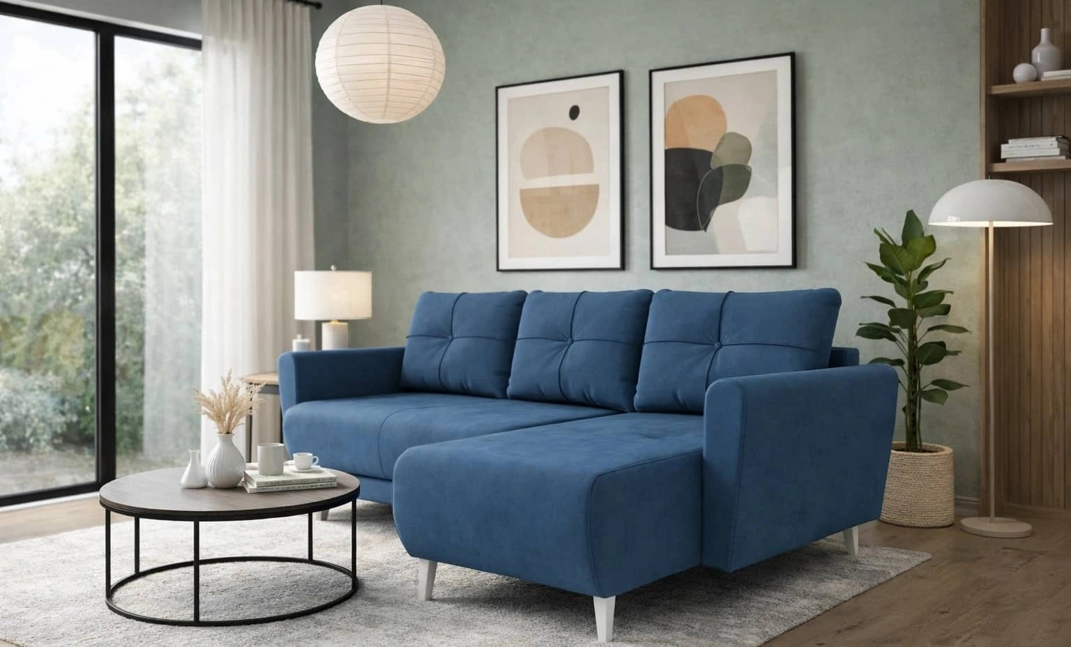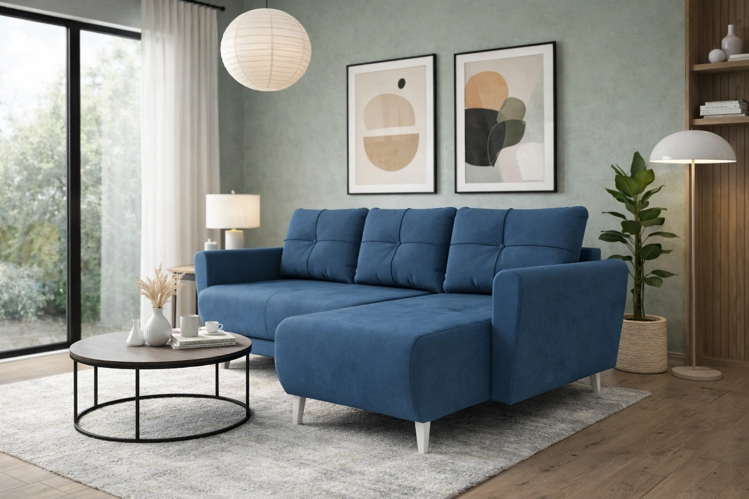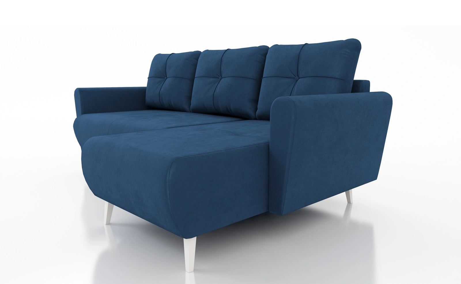 Ecksofa Felicie in Marineblau ist ein stilvolles Stück, das sich perfekt in jedes Arrangement in Ihrem Zuhause einfügen wird.