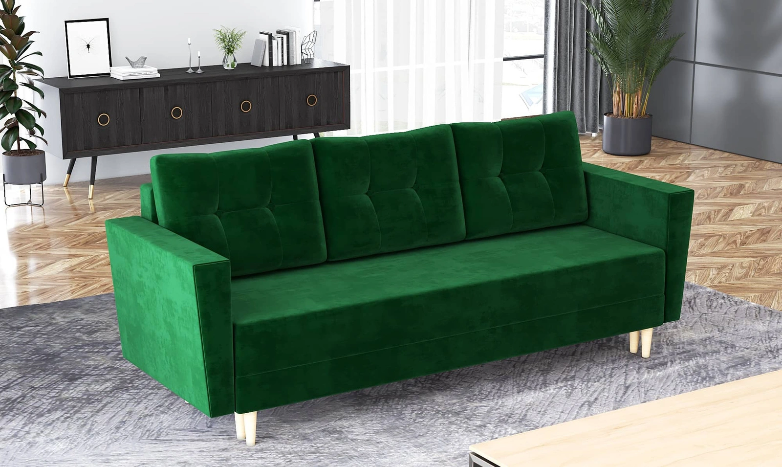 Schlafsofa Telsze in Flaschengrün ist ein stilvolles Stück, das sich perfekt in jedes Arrangement in Ihrem Zuhause einfügen wird.