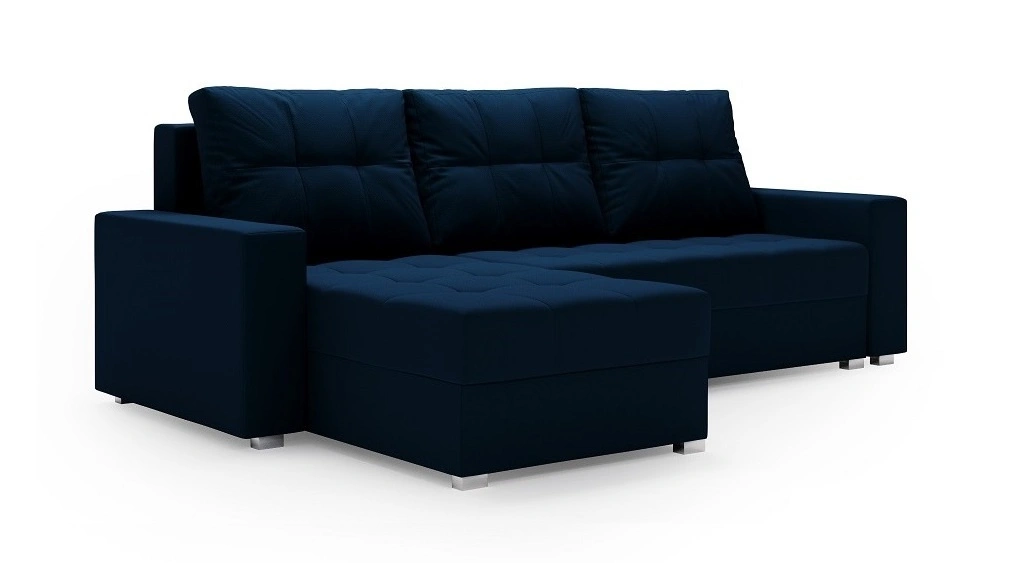 Ecksofa mit Schlaffunktion Pablos dunkelblau Universal-Ecksofa mit Bettwäsche-Container und dekorativer Steppung auf der Sitzfläche