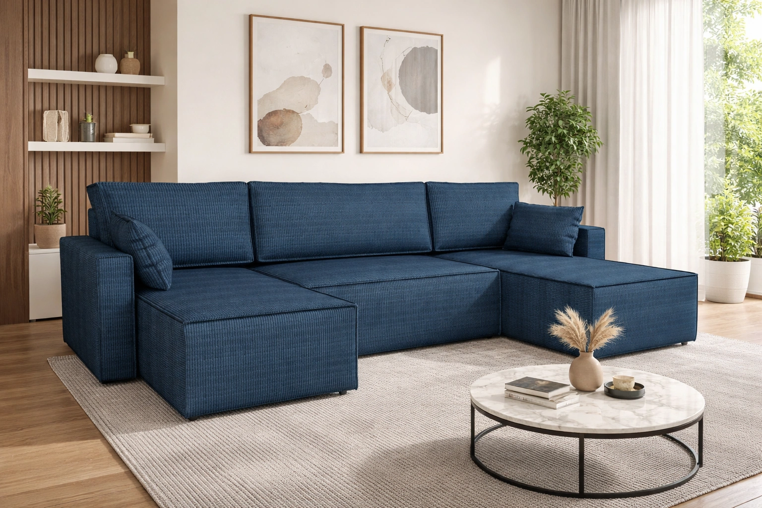 Dreidimensional kordstoff mit seiner ausgeprägten und dicken Rippung verleiht ihm einen besonderen Charakter und einzigartige Schönheit. Der Stoff ist sehr weich und dennoch stark und robust. Der Poso-Polsterungsstoff ist widerstandsfähig gegen Abrieb, und leicht sauber zu halten. So wird die Rebenes U-Liegeecke lange Zeit ästhetisch und elegant aussehen. Das Ecksofa mit täglicher Schlaffunktion ist aus hochwertigen Materialien gefertigt, die gegen äußere Einflüsse wie Möbelbezüge und verschiedene Arten von Stößen resistent sind.