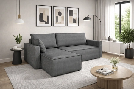 Das Ecksofa mit Schlaffunktion eignet sich dank seiner Abmessungen und seiner breiten Funktionalität ideal als Ecksofa für das Wohnzimmer oder als klappbares Ecksofa für das Gästezimmer. Ein Ecksofa mit Schlaffunktion ist auch eine gute Alternative zu einem Bett im Zimmer der jugendzimmer. Breite der Ecke 240 cm, höhe 85 cm und Tiefe 150 cm. Die Liegefläche des Eckschrankes beträgt 131x206 cm. Die Sitzhöhe des Möbels beträgt 41 cm, und die Höhe der Rückenlehne beträgt 45 cm. Gewellte Federn und T28-Polyurethanschaum ist das Material, aus dem der Sitz der Ecke hergestellt ist. Weich rückenlehnen-Kissen gewährleisten einen hohen Komfort bei der täglichen Erholung, den Sie und Ihre Gäste, die auf diesem einzigartigen Ecksofa sitzen, zu schätzen wissen werden.