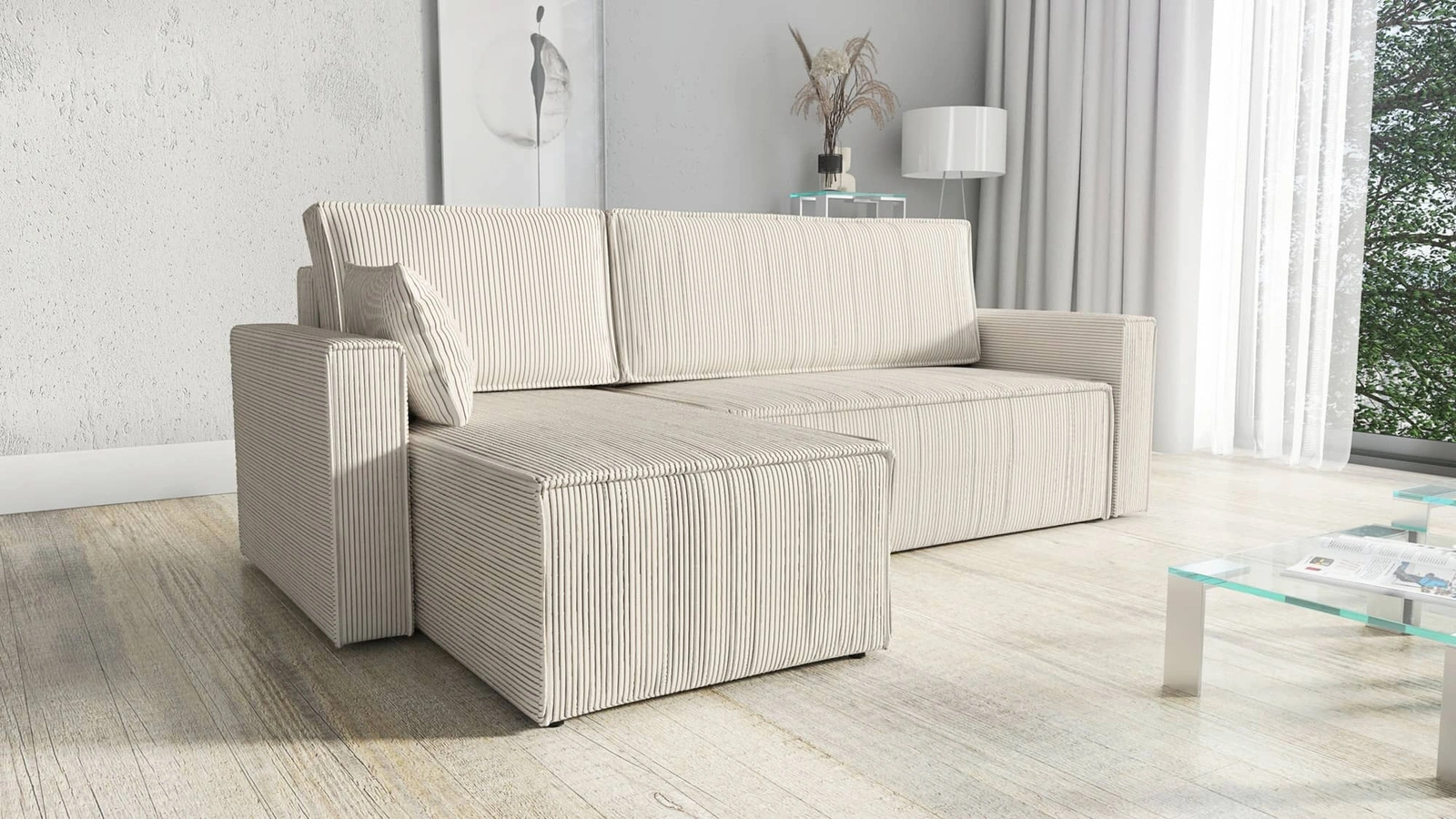 Dreidimensional kordstoff mit seiner ausgeprägten und dicken Rippung verleiht ihm einen besonderen Charakter und einzigartige Schönheit. Der Stoff ist sehr weich und dennoch stark und robust. Der Poso-Polsterungsstoff ist widerstandsfähig gegen Abrieb, und leicht sauber zu halten. So wird die Rebenes-Liegeecke lange Zeit ästhetisch und elegant aussehen. Das Ecksofa mit täglicher Schlaffunktion ist aus hochwertigen Materialien gefertigt, die gegen äußere Einflüsse wie Möbelbezüge und verschiedene Arten von Stößen resistent sind.