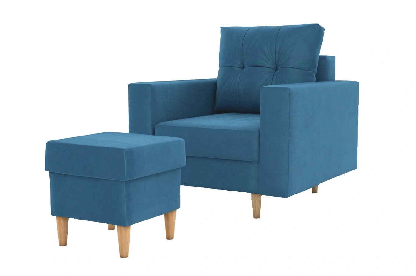 Sessel mit Fußstütze Vaso blau bequemer Sessel für Wohnzimmer im skandinavischen Stil weicher Sitz hohe Holzbeine