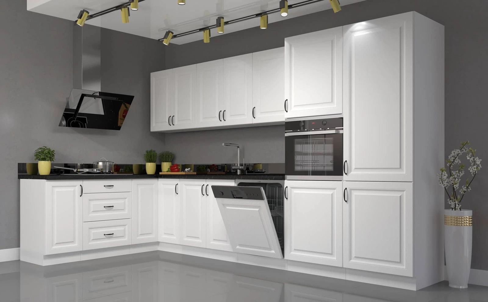 Die Front des weißen Standküchenschranks besteht aus MDF-Platte und endete mit stilvolle Tischlerei. Die Kante der Küchenschrankfront wird durch ein Furnier geschützt, das zwei Funktionen hat. Sie ist sicherheit gegen Feuchtigkeit und schützt gegen zufällige Beschädigung.