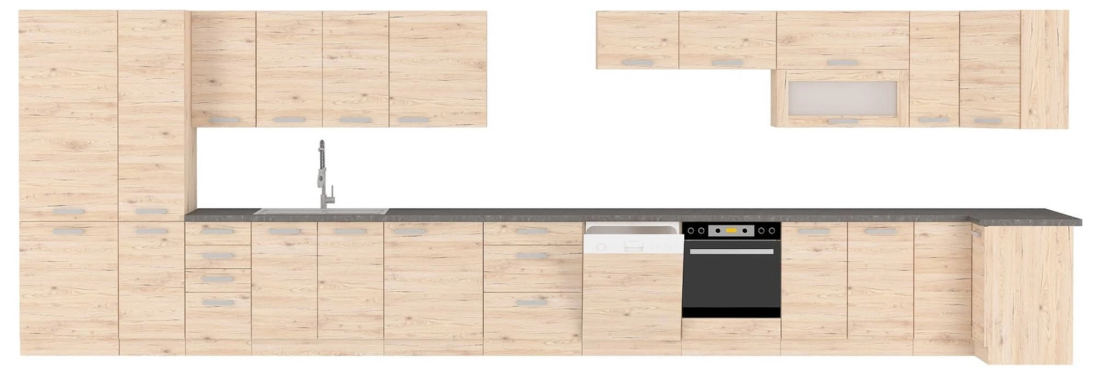 Fronten und Korpus der Küchenschränke sind von hoher Qualität laminierte Platte 16 mm dick. Der Vorteil dieses Kartentyps ist hohe Widerstandsfähigkeit gegen äußere Einflüsse wie Dampf, Hitze, verschüttete Flüssigkeiten. ABS-Furnierkanten erhöhen die Haltbarkeit des Küchenschranks. Einzigartige Holzmaserung unterstreicht die Eleganz der Möbel.