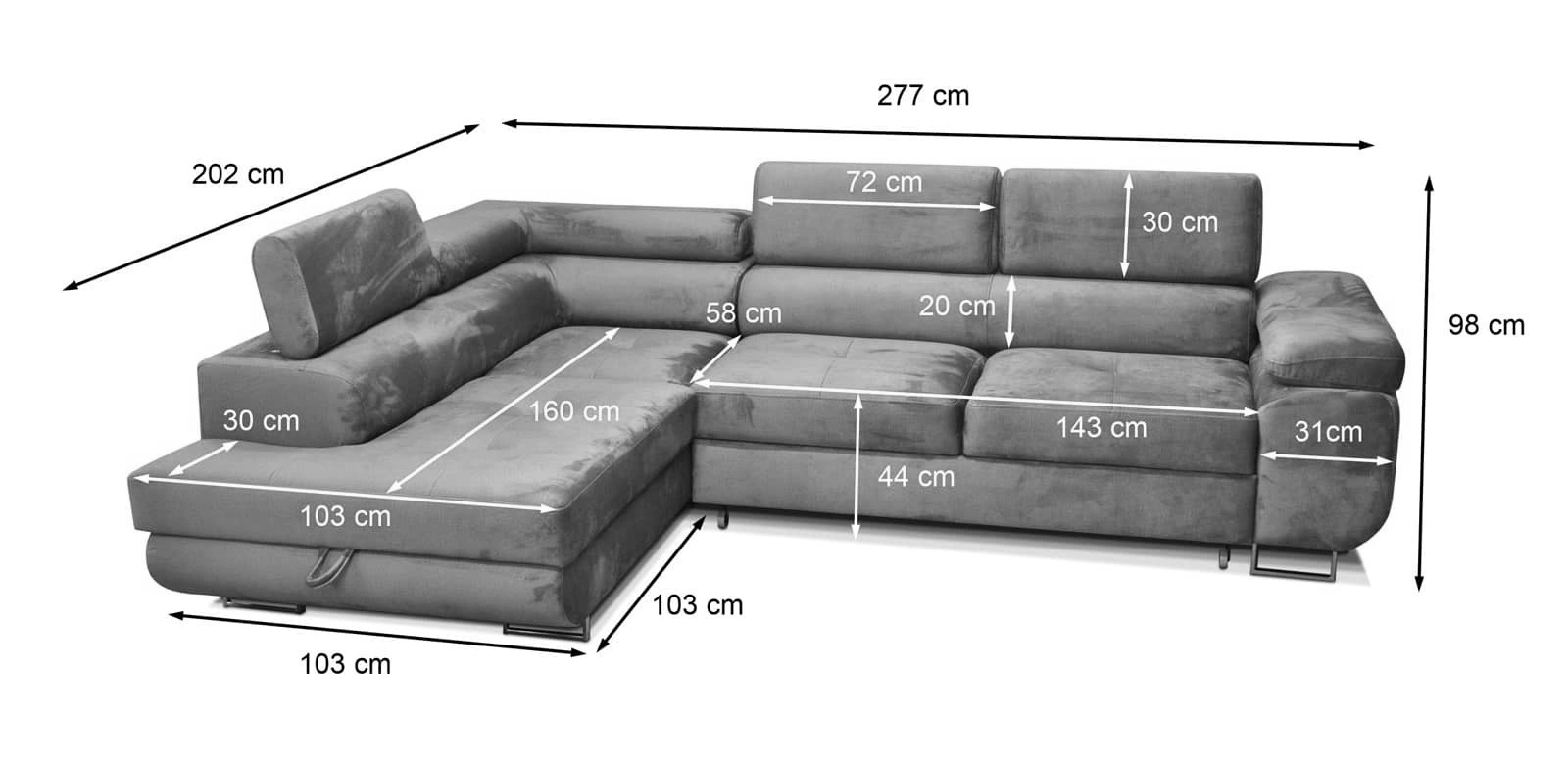 Die Abmessungen der Möbel sind optimal. Breite der Ecke 277 cm, maximale Höhe 98 cm und Tiefe 202 cm. Die Liegefläche der Eckeinheit ist 125x200 cm. Die Sitzhöhe des Möbels beträgt 45 cm und die maximale Höhe der Rückenlehne beträgt 50 cm. Gewellte Federn und T30-Polyurethanschaum ist das Material, aus dem der Sitz der Ecke gefertigt ist. Feste Rückenlehne mit verstellbaren Kopfstützen garantiert komfortable Entspannung nach einem langen Tag, die Sie, Ihre Lieben und auch Gäste, die auf diesem einzigartigen Ecksofa Platz nehmen, zu schätzen wissen werden!