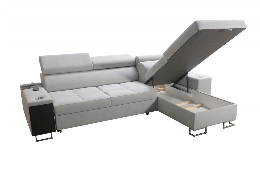 Weitere Merkmale dieses Möbelstücks, die von allen Nutzern geschätzt werden, sind ein Bettzeugbehälter, eine Schlaffunktion, Becherhalter in den Seiten, eine USB-Ladebuchse und eine Steckdose in der Seite des Eckmöbels sowie eine Schublade mit Vollauszug in der Seite des Möbels.
