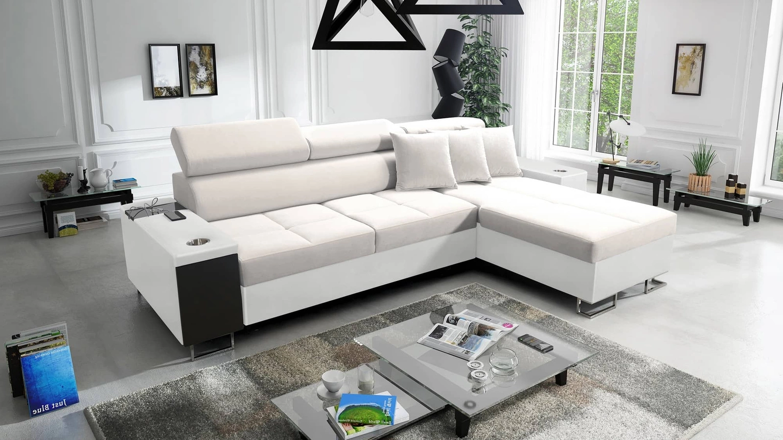 Ecksofa mit Schlaffunktion Dafni Elfenbein/Weiß mit verstellbaren Kopfstützen ist ein Rezept für ein modernes Interieur in Ihrem Zuhause!