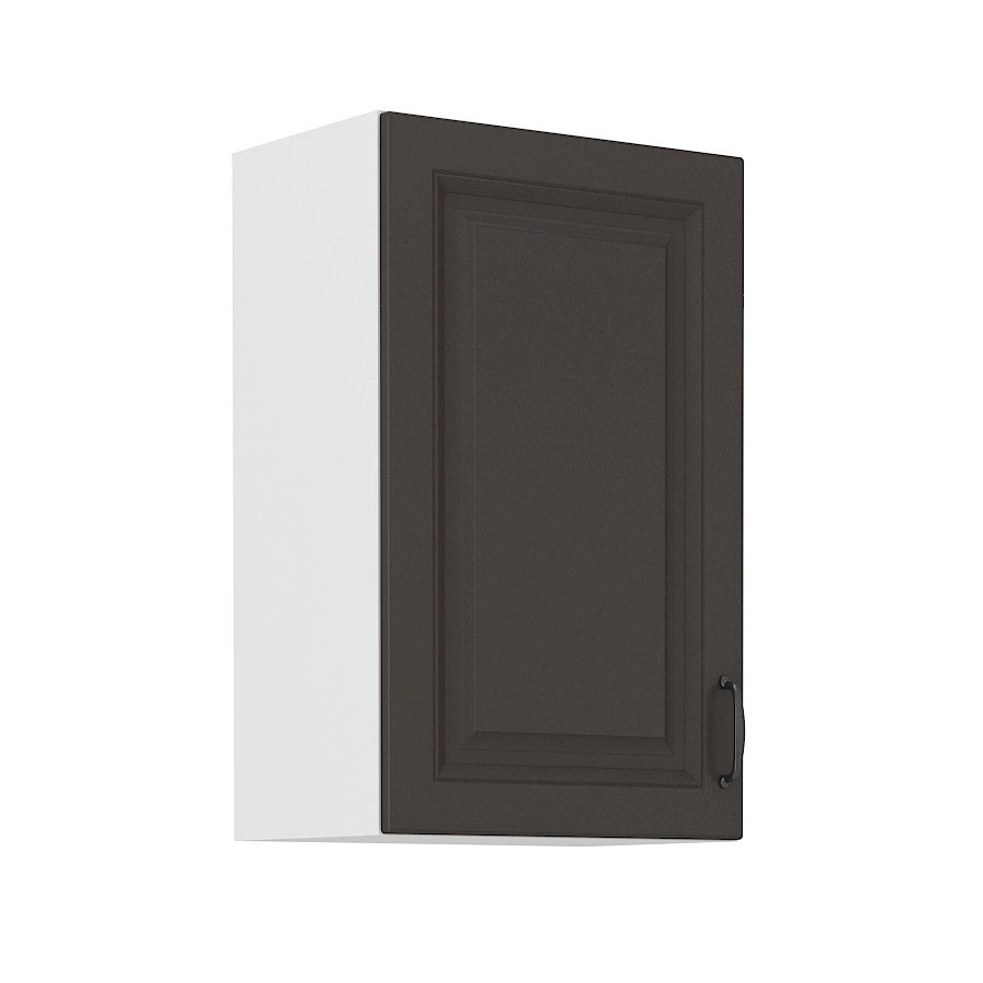 Die graphitfarbene Front des Küchenoberschrankes besteht aus mDF-Platte und endete mit stilvolle Tischlerei. Die Kante der Küchenschrankfront wird durch ein Furnier geschützt, das zwei Funktionen hat. Sie ist sicherheit gegen Feuchtigkeit und schützt gegen zufällige Beschädigung.