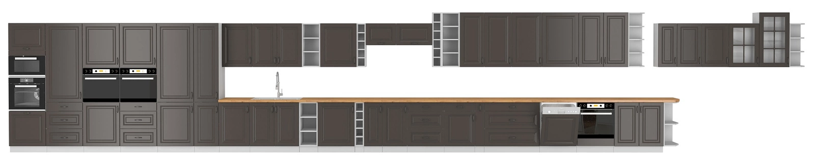 Teil der Küchenzeile mit regale, die in drei Stufen höhenverstellbar sind, um Platz für hohe Gegenstände zu schaffen. Unterer Teil mit 3 Schubladen hergestellt mit Premium Box. Die Premium Box Küchenpfostenschubladen zeichnen sich aus durch erhöhte Stärke, damit der Küchenschrank bis zum Rand mit Küchenutensilien und Zubehör gefüllt werden kann. Küchenschranktüren sind universell einsetzbar und können an den rechts oder auf der links website. Zur Standardausstattung der Küchenschränke gehören schubladen und Scharniere mit sanftem Einzug. Die Retarder erhöhen komfort i sicherheit verwendung von Möbeln.