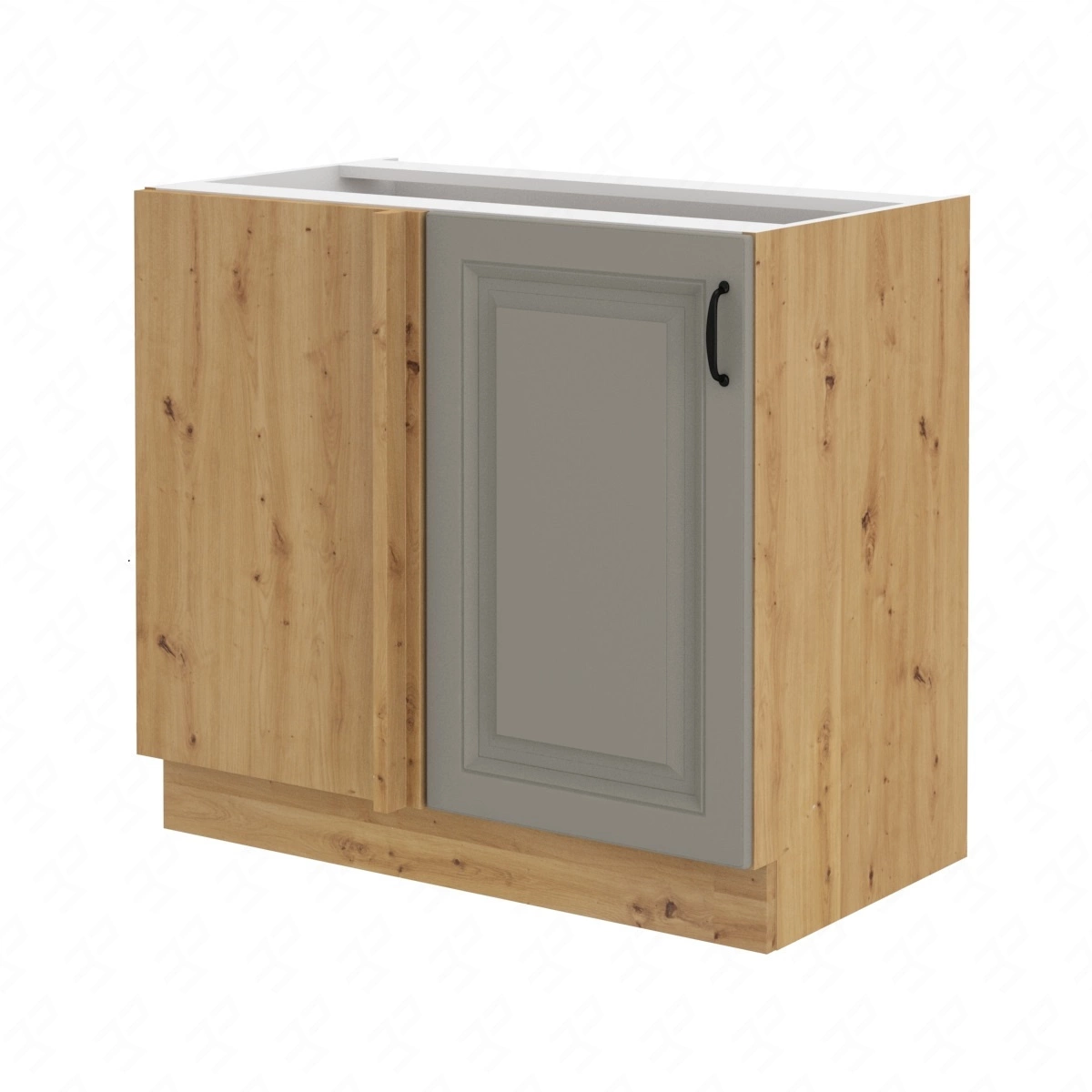 Der Delos-Eckschrank in grau-beige / Eiche artisan gehört zur Kategorie der modularen Küchenmöbel, aus denen sich jedes Set zusammenstellen lässt.