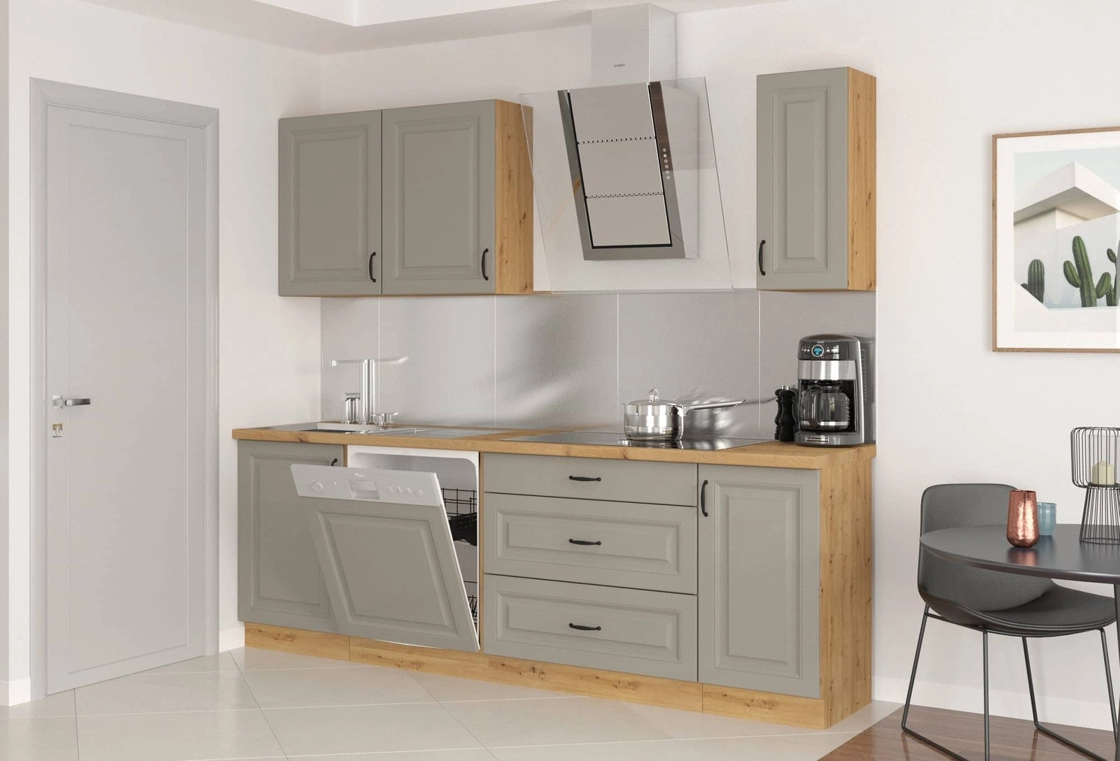 Das Küchenmöbelset Delos mit einer Länge von 230 cm ist eine ausgezeichnete Wahl für Räume, die Funktionalität mit zeitloser Ästhetik verbinden. Die Fronten in einem dezenten, grau-beigen Farbton harmonieren perfekt mit dem natürlichen Dekor des Korpus in Holzoptik und schaffen ein ausgewogenes Gesamtbild. Diese Farbgestaltung eignet sich hervorragend für Küchen in hellen Tönen, da sie den Raum aufhellt und eine gemütliche Atmosphäre schafft. Die Möbel bieten praktische Aufbewahrungsmöglichkeiten - dank zahlreicher Schränke und Schubladen - und ihre klassischen Fronten mit dekorativen Fräsungen verleihen der Küche einen raffinierten Charakter.
