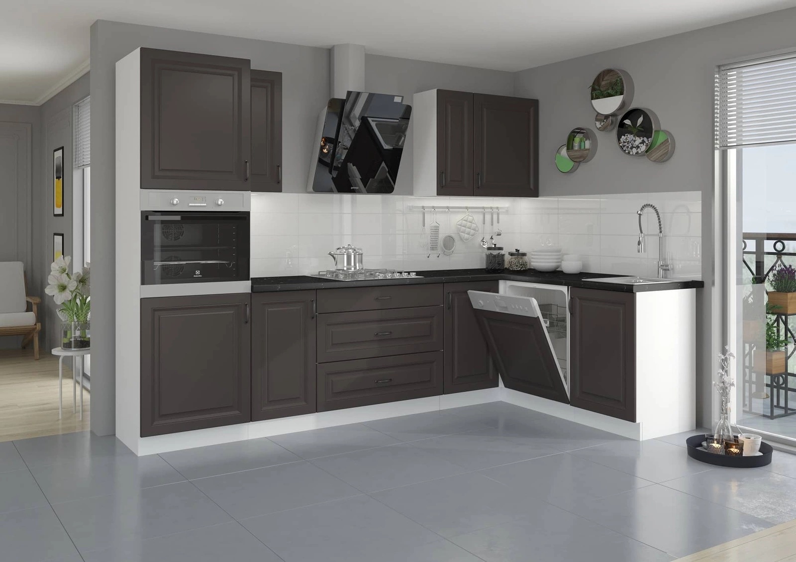 - Das Silver Eckküchenset ist ein Vorschlag für ein Set, das in skandinavischen, klassischen und modernen Interieurs gut aussieht. Graphitfarbene Fronten in matter Ausführung und weiße Korpusse verleihen den Möbeln einen besonderen Charakter.