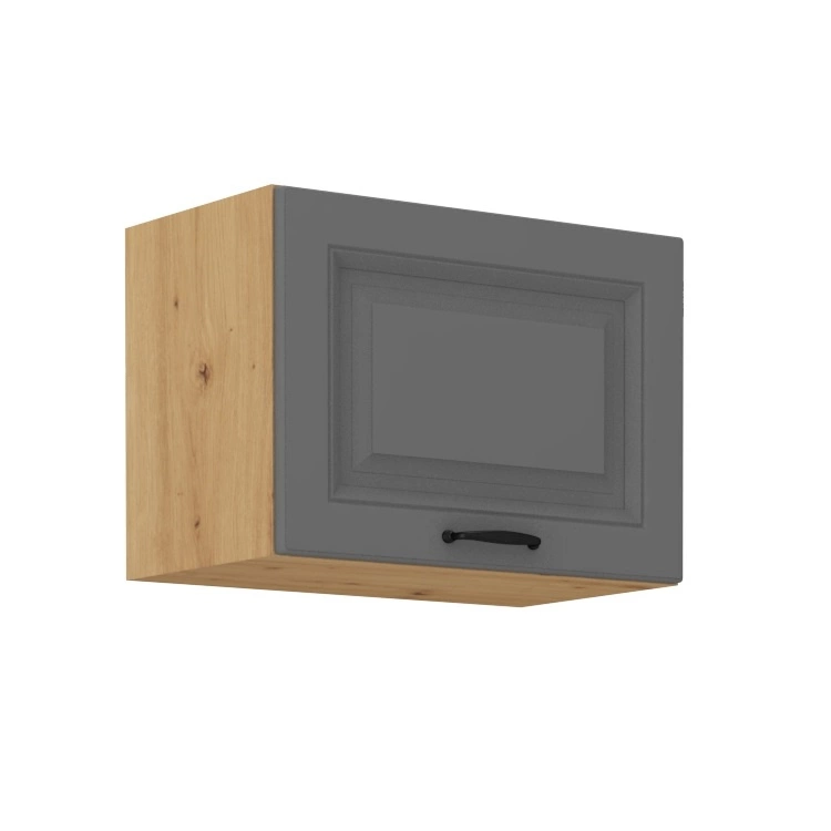 Die Front des Küchenoberschrankes in der Farbe graue Esche wurde hergestellt aus mDF-Platte und endete mit stilvolle Tischlerei. Die Kante der Küchenschrankfront ist durch ABS-Furnier geschützt, das zwei Funktionen hat. Sie ist sicherheit gegen Feuchtigkeit und schützt gegen zufällige Beschädigung.