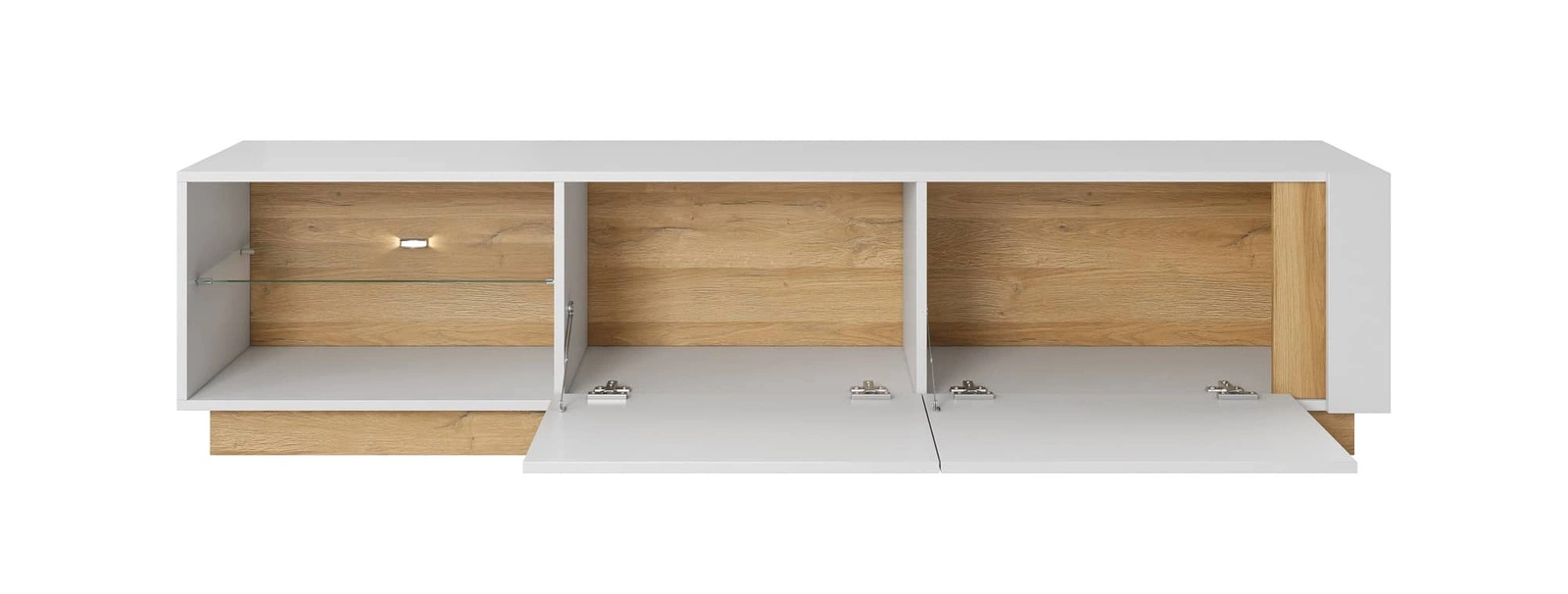 Die Schrankwand Adria ist die ideale Wahl für Liebhaber moderner Arrangements mit elegantem Charakter, für die eine breite Palette von funktionalität möbel. Weiß fronten fertiggestellt in hochglanz werden durch Einschübe unterbrochen in enkel Eiche. Die Schrankwand ist aus hochwertigem Material gefertigt laminierte Platte, die gekennzeichnet ist durch widerstand gegen äußere Einflüsse wie Prellungen, Stöße und unglückliche Kratzer. Fronten aus mDF-Platte glänzende Folienoberfläche. Die Sideboards und der RTV-Schrank der Schrankwand sind mit Glasböden ausgestattet, die mit LED-Leuchten beleuchtet werden können.
