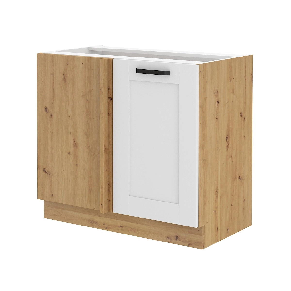 Der Eckküchenschrank Luis 105 ND 1F BB links ist eine perfekte Kombination aus Eleganz, modernem Design und Haltbarkeit. Die Front in klassischem Weiß, kombiniert mit einem Korpus in einem warmen, natürlichen Holzton, bildet eine harmonische Einheit, die sich ideal in helle, geräumige Küchen einfügt. Aufgrund seiner universellen Farbgestaltung passt das Möbelstück sowohl zu weißen Arbeitsplatten als auch zu dunkleren Akzenten. Der Schrank wurde aus Materialien gefertigt, die beständig gegenüber Dampf, hohen Temperaturen und verschütteten Flüssigkeiten sind, was ihn zu einer besonders praktischen Wahl für eine stark genutzte Küche macht.