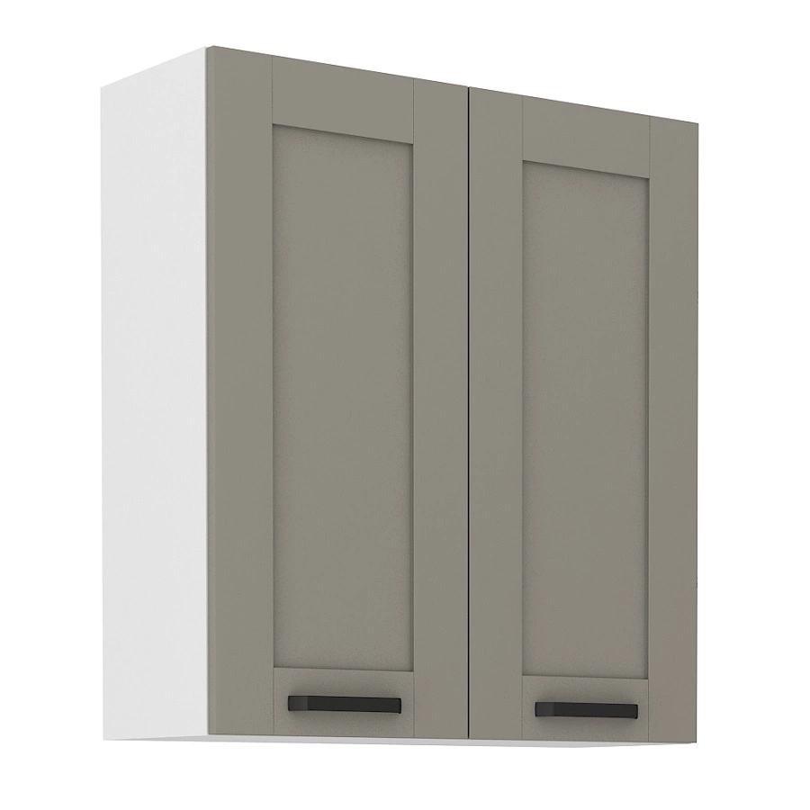 Küchen-Hängeschrankfronten in grau-beige sind aus MDF-Platten hergestellt und mit einem Rahmen im -Stil abgeschlossen. Die Kanten von Küchenschrankfronten werden durch ein Furnier geschützt, das zwei Funktionen hat. Es ist eine Sicherheit gegen Feuchtigkeit und schützt die gegen zufällige Beschädigung.