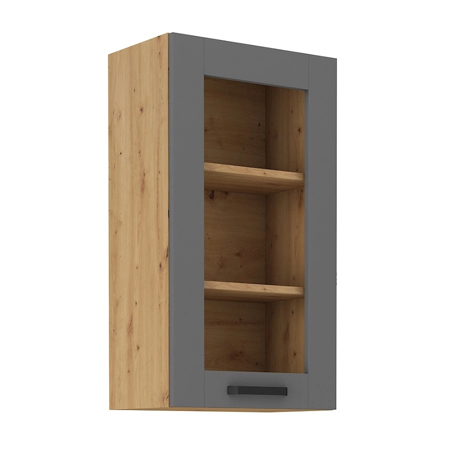 Vorderseite des Küchenoberschrankes in der Farbe graue Asche besteht aus mDF und endete mit stilvoller Rahmen und Glasvitrine. Die Kante der Küchenschrankfront wird durch ein Furnier geschützt, das zwei Funktionen hat. Sie ist sicherheit gegen Feuchtigkeit und schützt gegen zufällige Beschädigung.