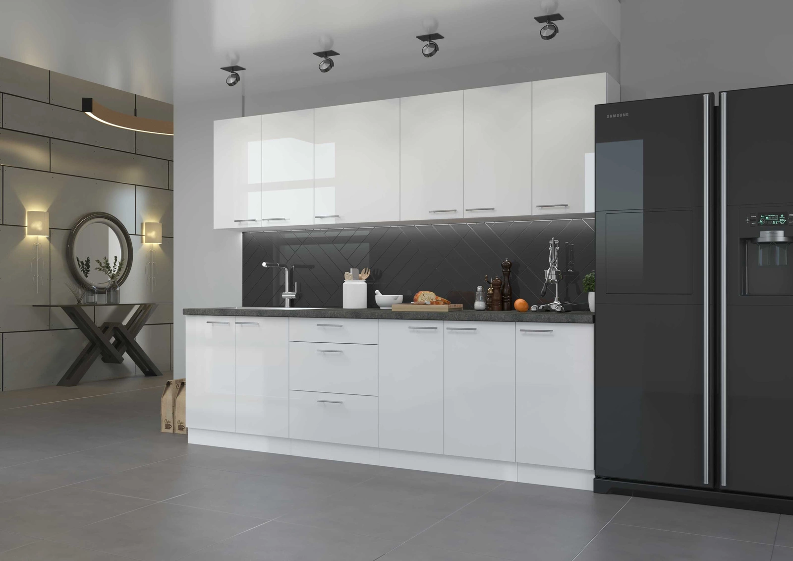 Die Verwendung einer solchen Lösung erhöht komfort und Sicherheit verwendung, und die Fronten schließen sich lautlos. Der Korpus jeder Küchenzeile ist aus hochwertigem Material gefertigt laminierte Platte 16 mm dick. Die Kanten sind durch ABS-Furniere geschützt. Fronten von Küchenschränken aus hochfester Möbelplatte, furniert mit glänzender Folie.