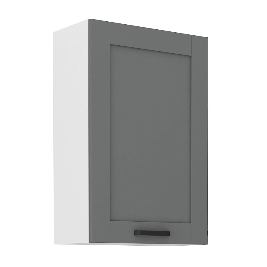 Vorderseite des Küchenoberschrankes in der Farbe graue Asche besteht aus mDF und endete mit ein stilvoller Rahmen. Die Kante der Küchenschrankfront ist durch ABS-Furnier geschützt, das zwei Funktionen hat. Sie ist sicherheit gegen Feuchtigkeit und schützt gegen zufällige Beschädigung.