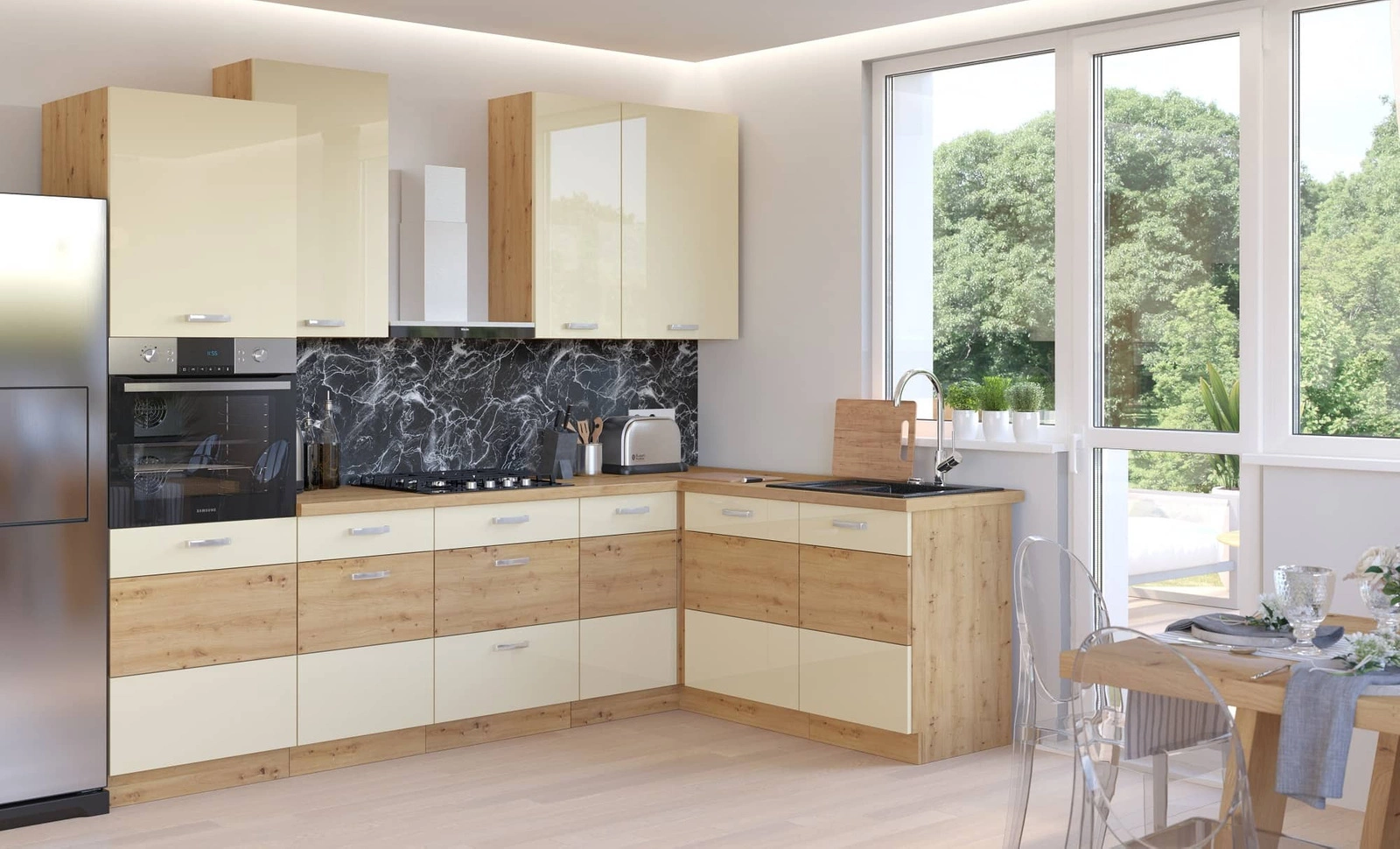 Die Vorderkante ist durch ein Furnier geschützt, das zwei Funktionen hat. Sie ist feuchtigkeitsschutz und schützt vor versehentlicher Beschädigung. Der Sockel ist aus einer hochwertigen 16 mm dicken laminierten Platte gefertigt. Der Vorteil dieses Kartontyps ist seine hohe Widerstandsfähigkeit gegen äußere Einflüsse wie Dampf, hohe Temperaturen und verschüttete Flüssigkeiten. ABS-Furnierkanten erhöhen die Stabilität des Gehäuses.