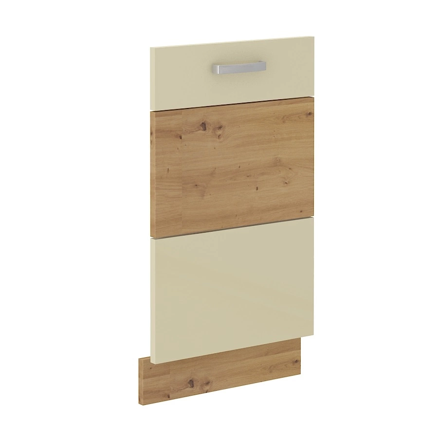 Geschirrspülerfront 45 cm Porto in cremefarben aus MDF wird durch eine eichenfarbene handwerkliche Einlage unterbrochen.