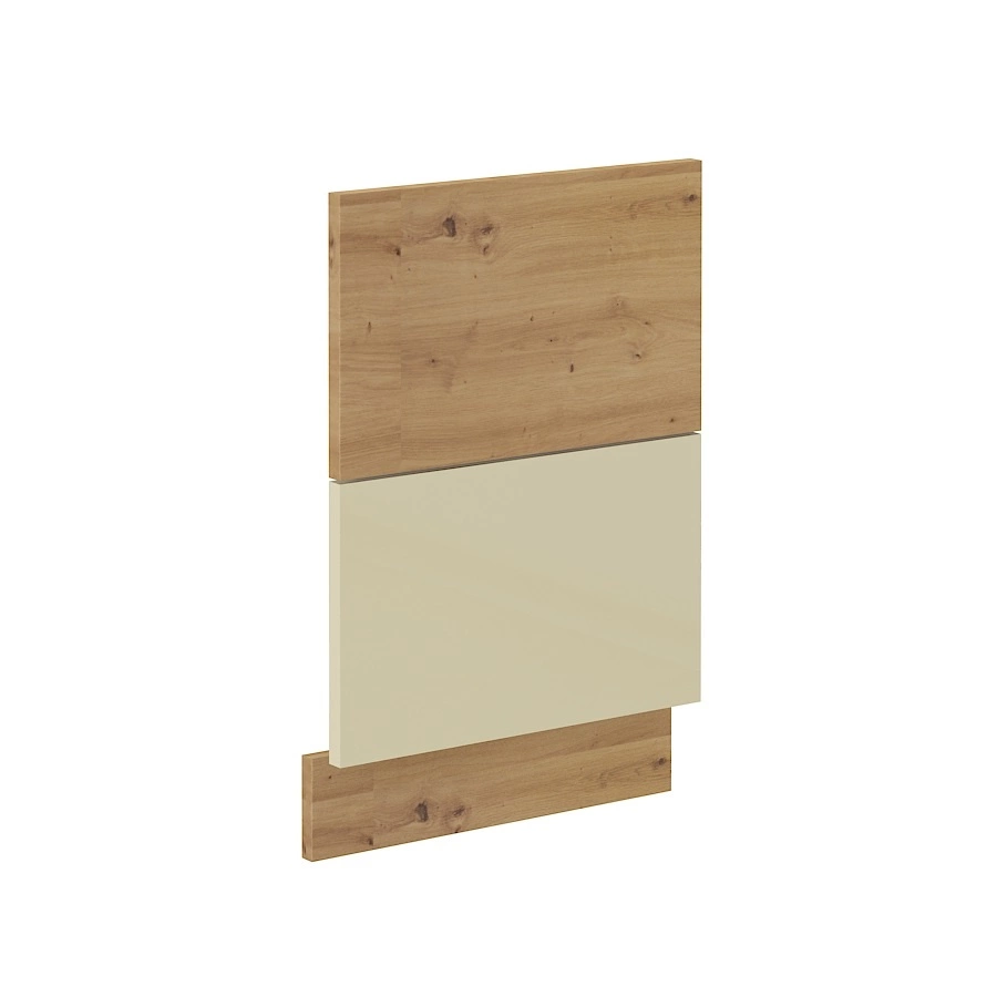 Geschirrspülerfront 45 cm Porto in cremefarben aus MDF wird durch eine eichenfarbene handwerkliche Einlage unterbrochen.