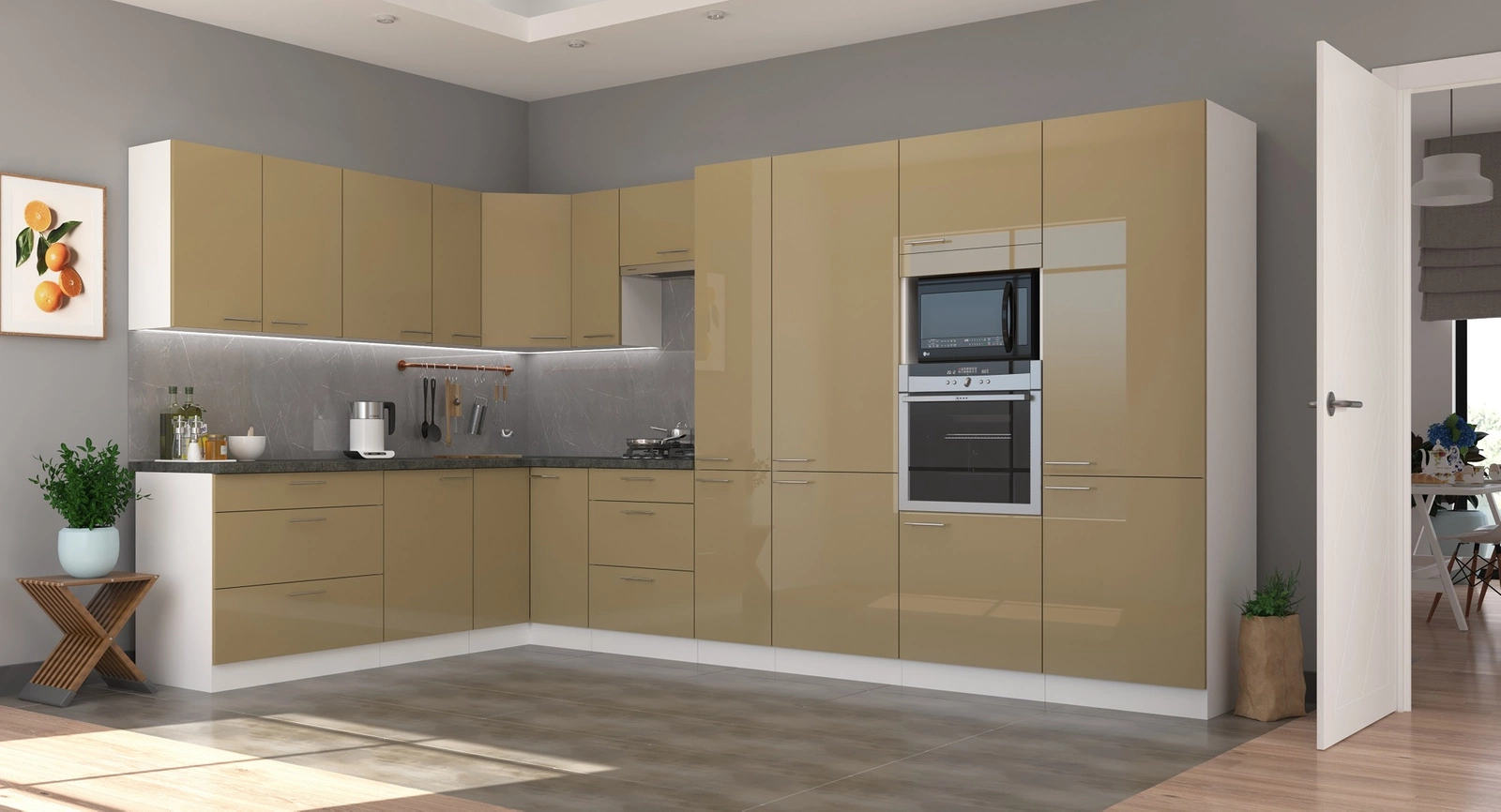 Die beigen Fronten sind aus möbelplatte und mit Folie überzogen in glänzend. Die Vorderkanten sind durch ABS-Furnier geschützt, das zwei Funktionen hat. Es ist sicherheit gegen Feuchtigkeit und schützt gegen zufällige Beschädigung.
