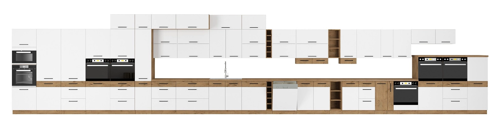 Das Küchenmöbelset Vento mit einer Breite von 220 cm vereint Ästhetik und Alltagstauglichkeit auf besondere Weise. Die glänzend weißen oberen Fronten harmonieren perfekt mit den warmen Eichenholz-Dekoren der Korpusse und unteren Schränke, wodurch ein modernes und zugleich stimmiges Gesamtbild entsteht. Dieses kontrastreiche, dennoch zurückhaltende Design passt sowohl in helle als auch dunklere Küchen, bringt Licht in den Raum und verleiht ihm eine elegante Note. Das Set eignet sich ideal für offene Wohnküchen sowie kleinere Räume, in denen ein durchdachter Aufbau und Funktionalität gefragt sind.