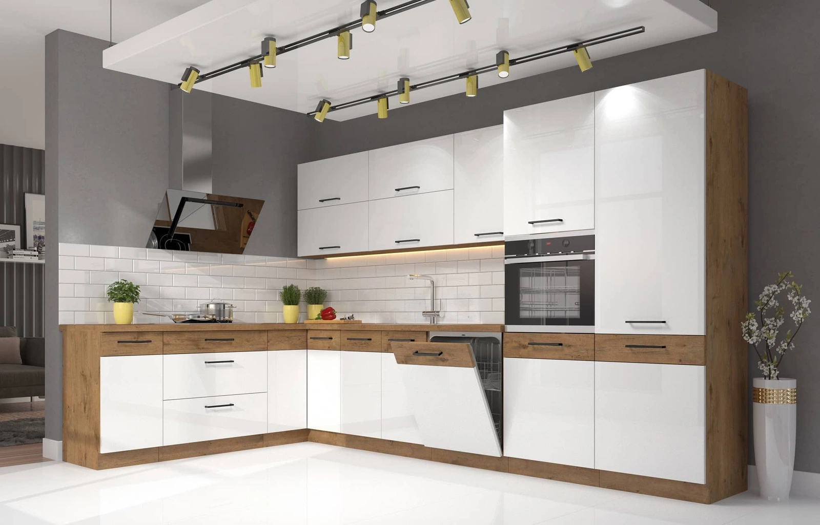Das Eckküchenmöbel-Set Ventom 210x350 cm fügt sich perfekt in modern und klassisch eingerichtete Räume ein. Das minimalistische Design und die weißen Hochglanzfronten harmonieren perfekt mit modernen Einrichtungen und verleihen ihnen Eleganz und Geräumigkeit. Natürliche Holzakzente sorgen für Wärme und Gemütlichkeit und machen dieses Set auch zu einer guten Wahl für klassische Küchen. Ventom verbindet Funktionalität und Ästhetik auf harmonische Weise und ist damit ein vielseitiges Möbelstück, das sowohl zu hellen, minimalistischen Räumen als auch zu traditionelleren Interieurs passt.