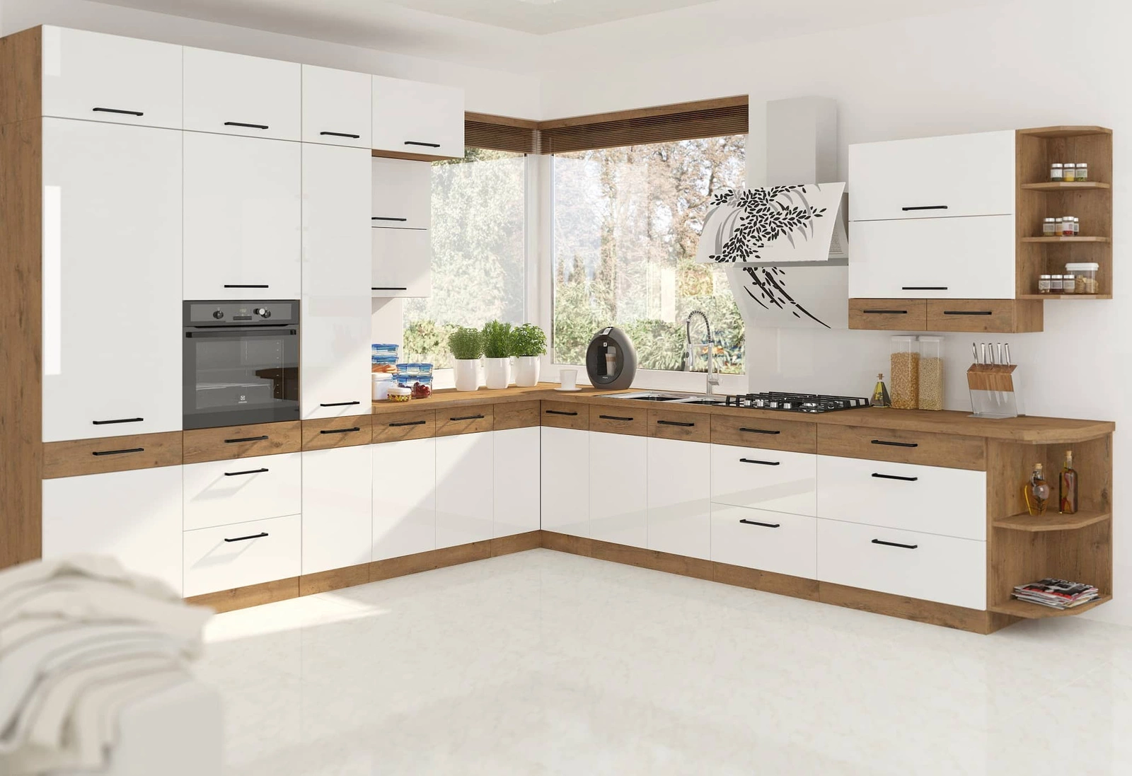 Das Eck-Küchenmöbelset Vento 330x340 cm ist eine ideale Wahl für alle, die maximale Funktionalität und ansprechendes Design in einer geräumigen Küche suchen. Die Kombination aus weißen, glänzenden Fronten und Korpussen sowie Arbeitsplatten in einem warmen Eichenfarbton erzeugt einen kontrastreichen und äußerst ästhetischen visuellen Effekt. Diese Farbgestaltung hellt den Raum auf, vergrößert ihn optisch und schafft gleichzeitig eine gemütliche Atmosphäre. Das Set eignet sich perfekt für offene Küchen, die mit dem Wohnzimmer verbunden sind, oder für große Räume, in denen eine ergonomische Anordnung der Geräte und viel Stauraum wichtig sind.