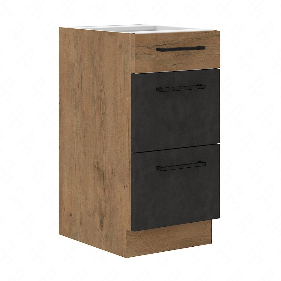 Der freistehende Küchenschrank mit Schubladen Valico 40 D-3S-BB ist ein funktionaler und stilvoller Bestandteil der Küchenausstattung, der modernes Design und praktische Lösungen vereint. Aus hochwertigen Materialien gefertigt, ist er beständig gegen Wasserdampf, hohe Temperaturen und verschüttete Flüssigkeiten, was ihn außergewöhnlich langlebig und pflegeleicht macht. Der Schrank verfügt über drei geräumige Schubladen, die viel Platz bieten, um verschiedene Küchenutensilien aufzubewahren, und somit Ordnung und Organisation ermöglichen. Die dunklen Fronten in Kombination mit den Holzseiten verleihen ihm ein elegantes Aussehen, das sich perfekt in verschiedene Küchenstile einfügt.