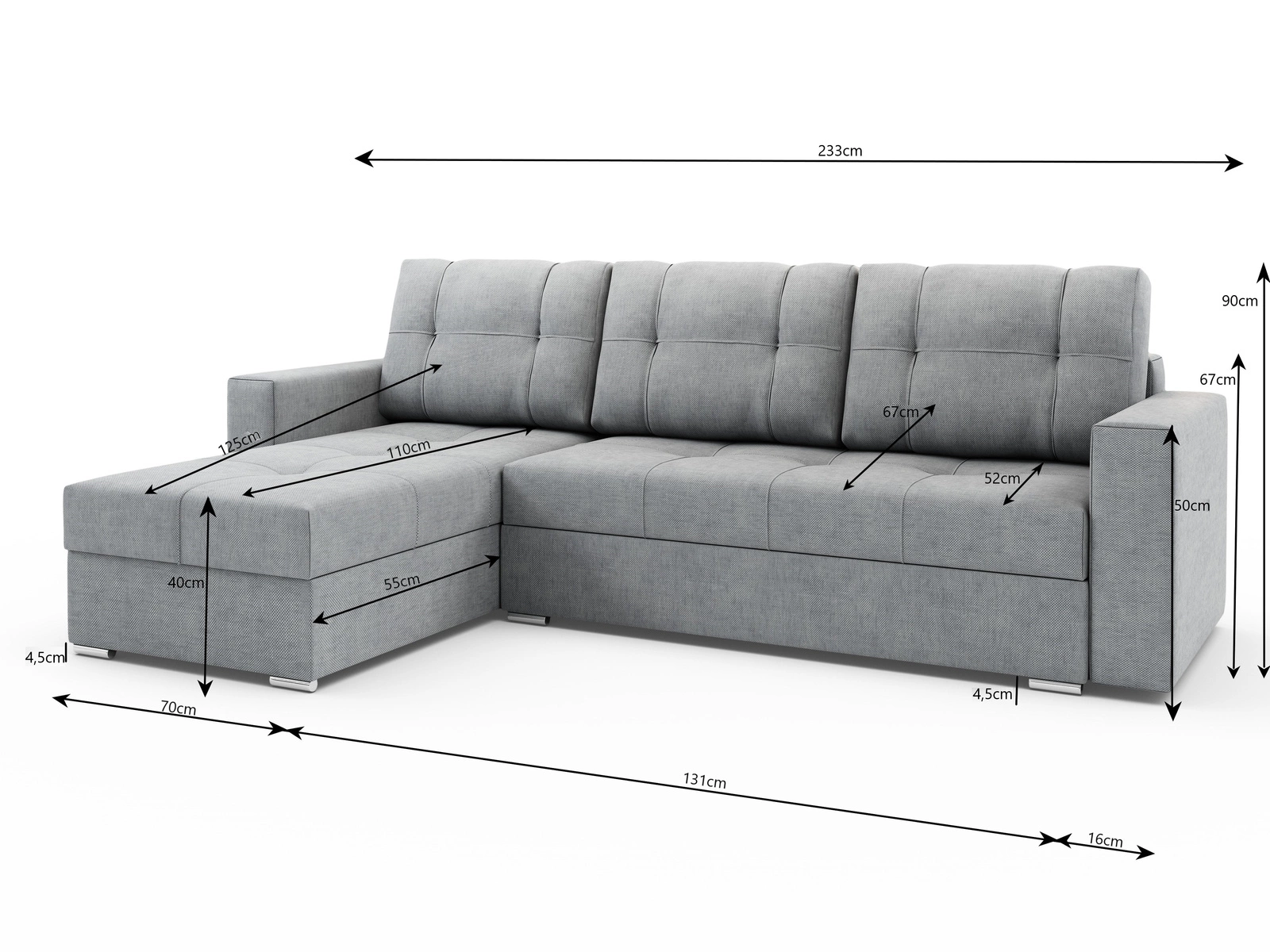 Die Abmessungen der Möbel sind optimal. Breite der Ecke 233 cm, maximale Höhe 90 cm und Tiefe 140 cm. Die Liegefläche der Eckeinheit ist 130x200 cm. Die Sitzhöhe des Möbels beträgt 40 cm und die maximale Höhe der Rückenlehne beträgt 50 cm. Gewellte Federn und T30-Polyurethanschaum ist das Material, aus dem der Sitz der Ecke gefertigt ist. Rückenlehne kissen garantiert komfortable Entspannung nach einem langen Tag, die Sie, Ihre Lieben und auch Gäste, die auf diesem einzigartigen Ecksofa Platz nehmen, zu schätzen wissen werden!